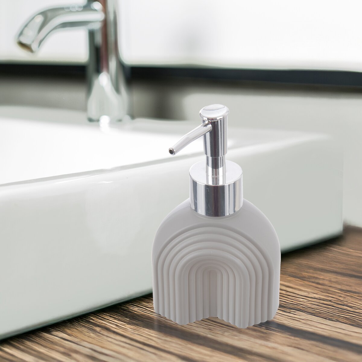 Kód produktu 530793Skleněný dávkovač mýdla nebo saponátu o objemu 0,18 l je zdoben zajímavým reliéfem a má šedý nástřik.