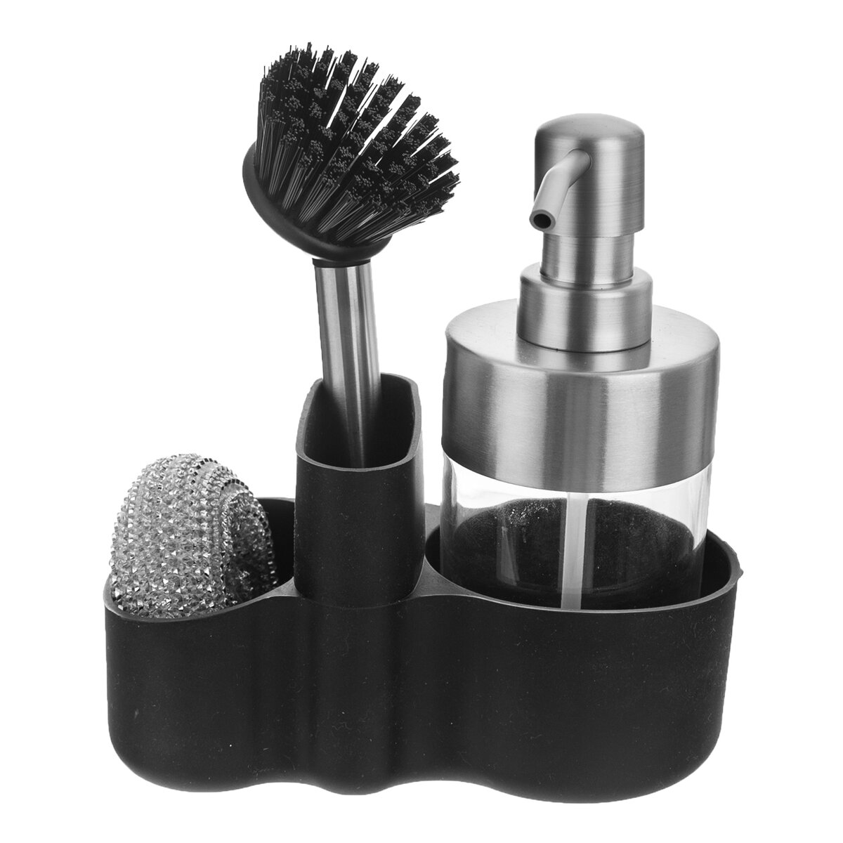 Kód produktu 530787Plastový dávkovač saponátu nebo mýdla o objemu 0,35 l je uložen do černé plastové základny a doplněn kartáčkem a kovovou drátěnou. Usnadní umývání nádobí ve dřezu nebo rukou v koupelně.