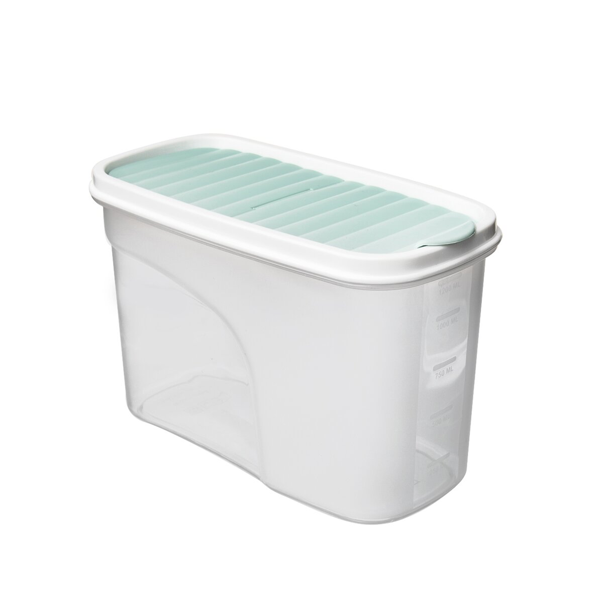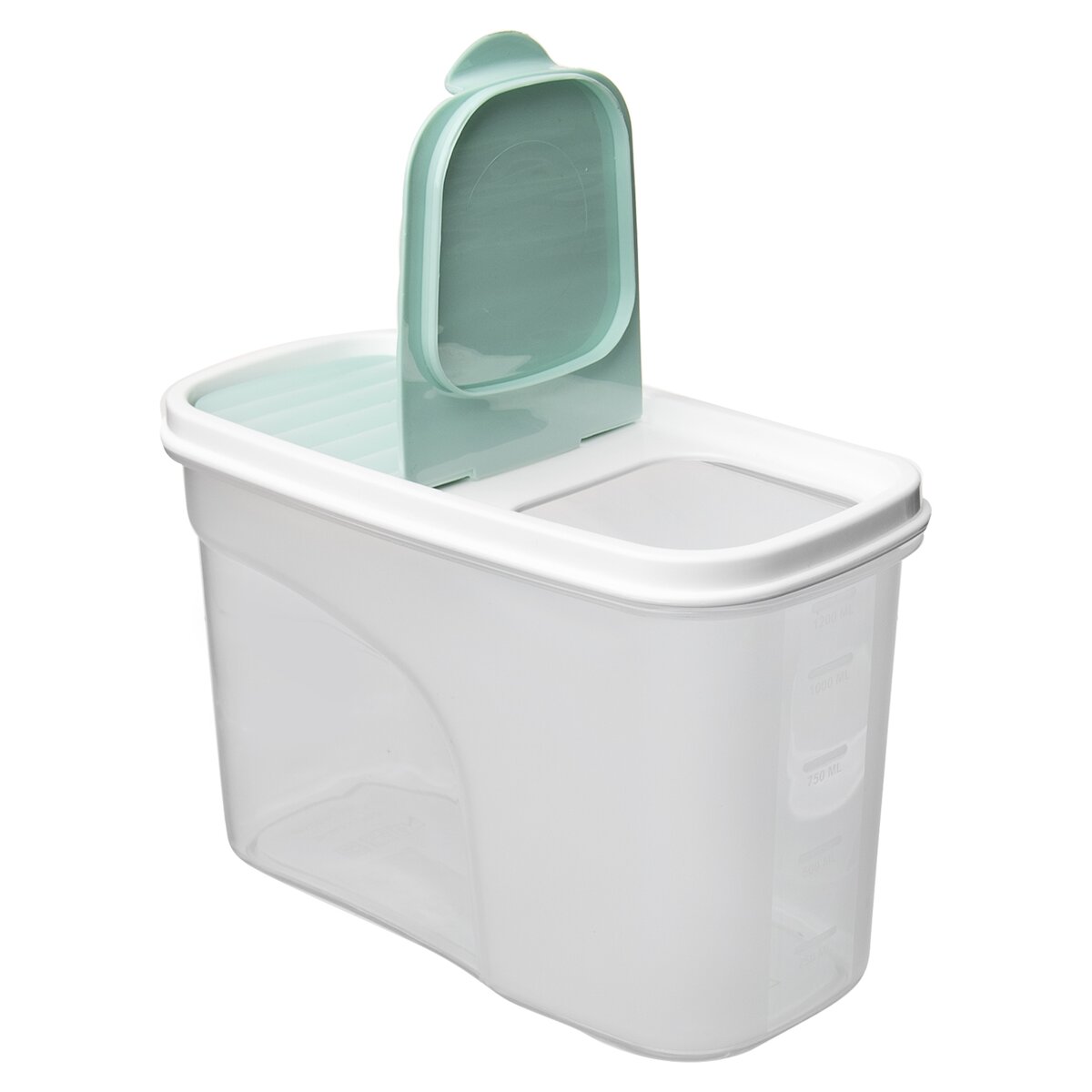 Kód produktu 127140Poloprůhledná dóza BONNY o objemu 1,2 l s praktickým odklápěcím víčkem a vyznačenou měrnou stupnicí.