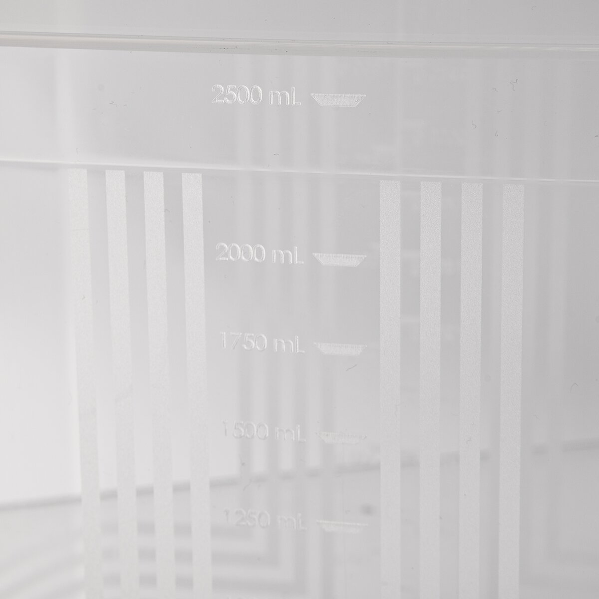 Její víčko zabraňuje nejen navlhnutí potravin, ale také jejich rozsypání ve spíži nebo přejímání chutí a vůní okolních surovin. Dóza je transparentní, díky čemuž snadněji rozpoznáte její obsah. Navíc jsou na ní natištěné odměrné stupnice pro tekuté i sypké potraviny – pro vodu a mléko od 250 ml do 2,5 l, pro cukr od 250 g do 2,5 kg nebo pro mouku od 250 g do 1,75 kg. Speciální tvar víčka umožňuje stohování nádob.