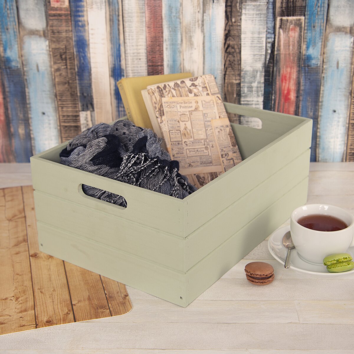 Kód produktu 731058Dřevěná bedýnka v tlumené, světle zelené barvě, o velikosti 36x26x15 cm, pomůže uspořádat věci denní potřeby, poslouží i jako zajímavá dekorace v interiéru.