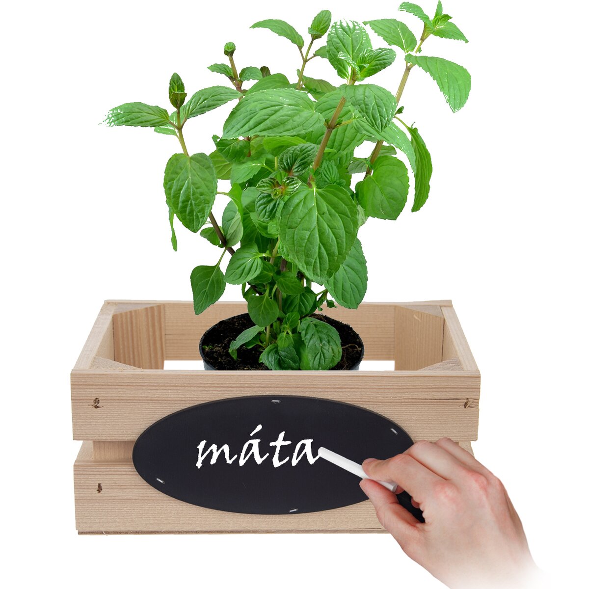 Uprostřed má černou tabulku, na kterou můžete křídou nebo bílým fixem napsat název vložených bylinek, jméno oslavence nebo vzkaz.