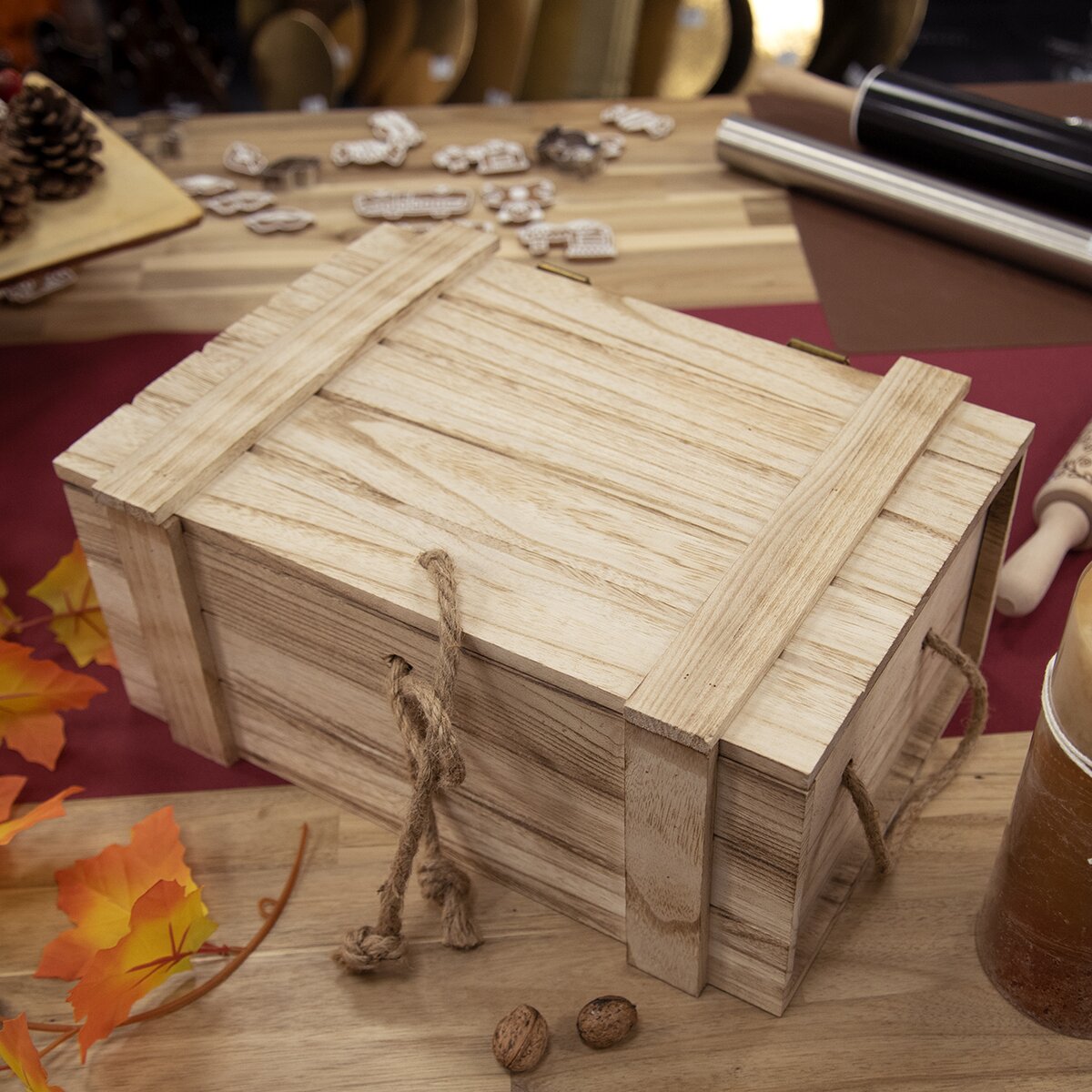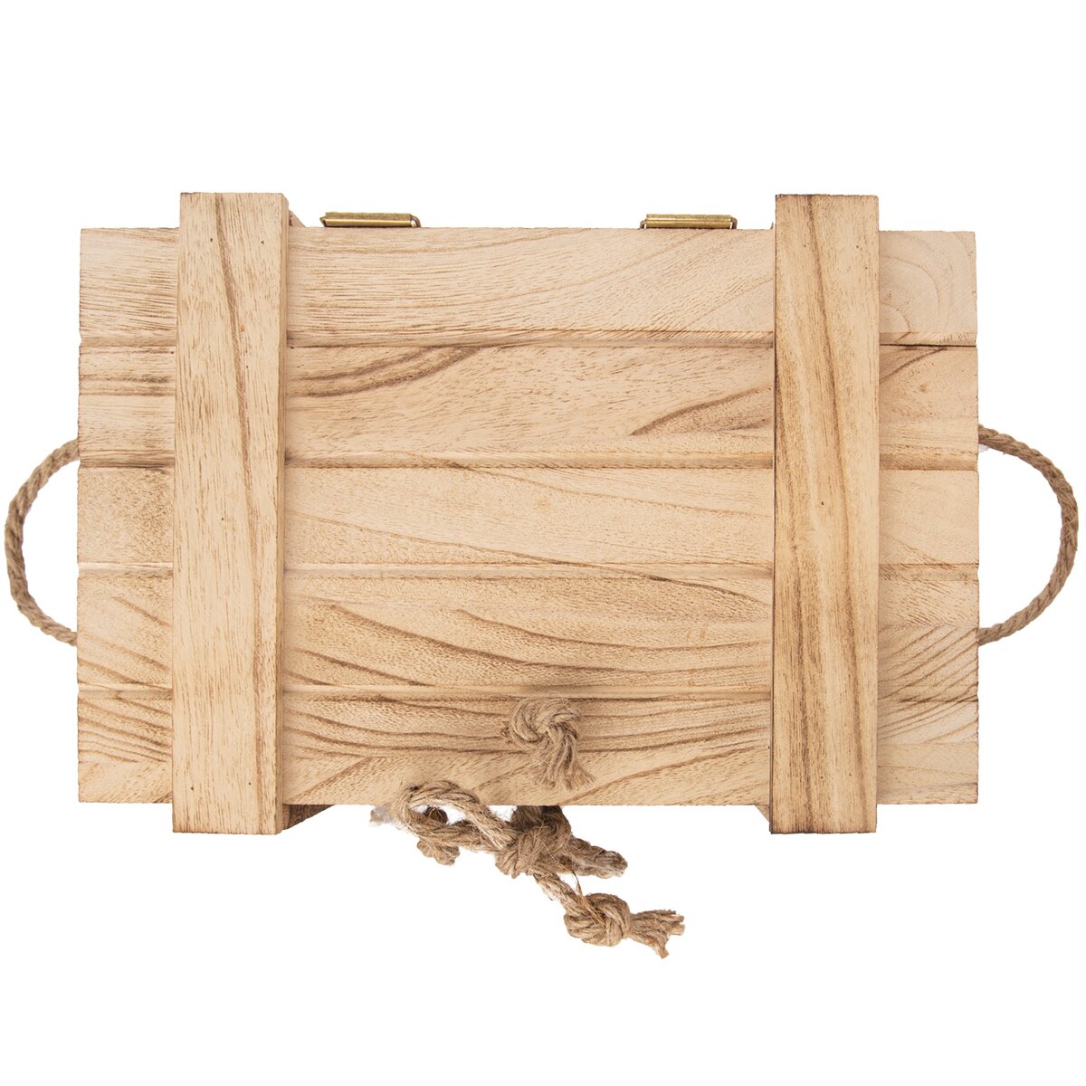 Má dřevěné víko, její obsah tak snadno skryjete před nechtěnými pohledy. Navíc ji lze využít i jako stylový obal na vaše ručně vyrobené dárky. Její přenesení až k oslavenci usnadní dvě provazová ucha z juty.