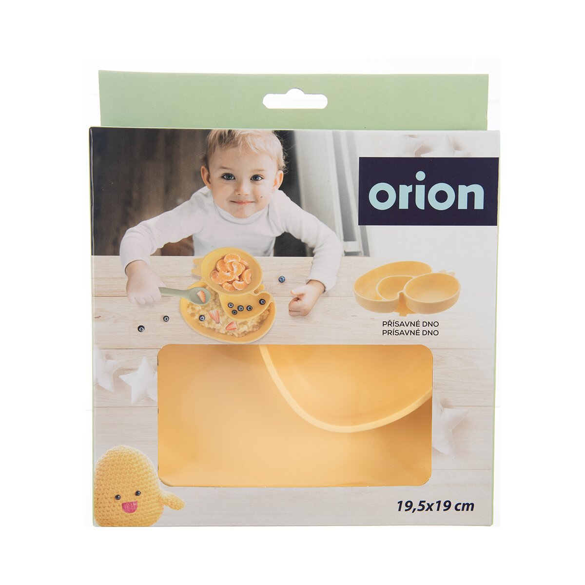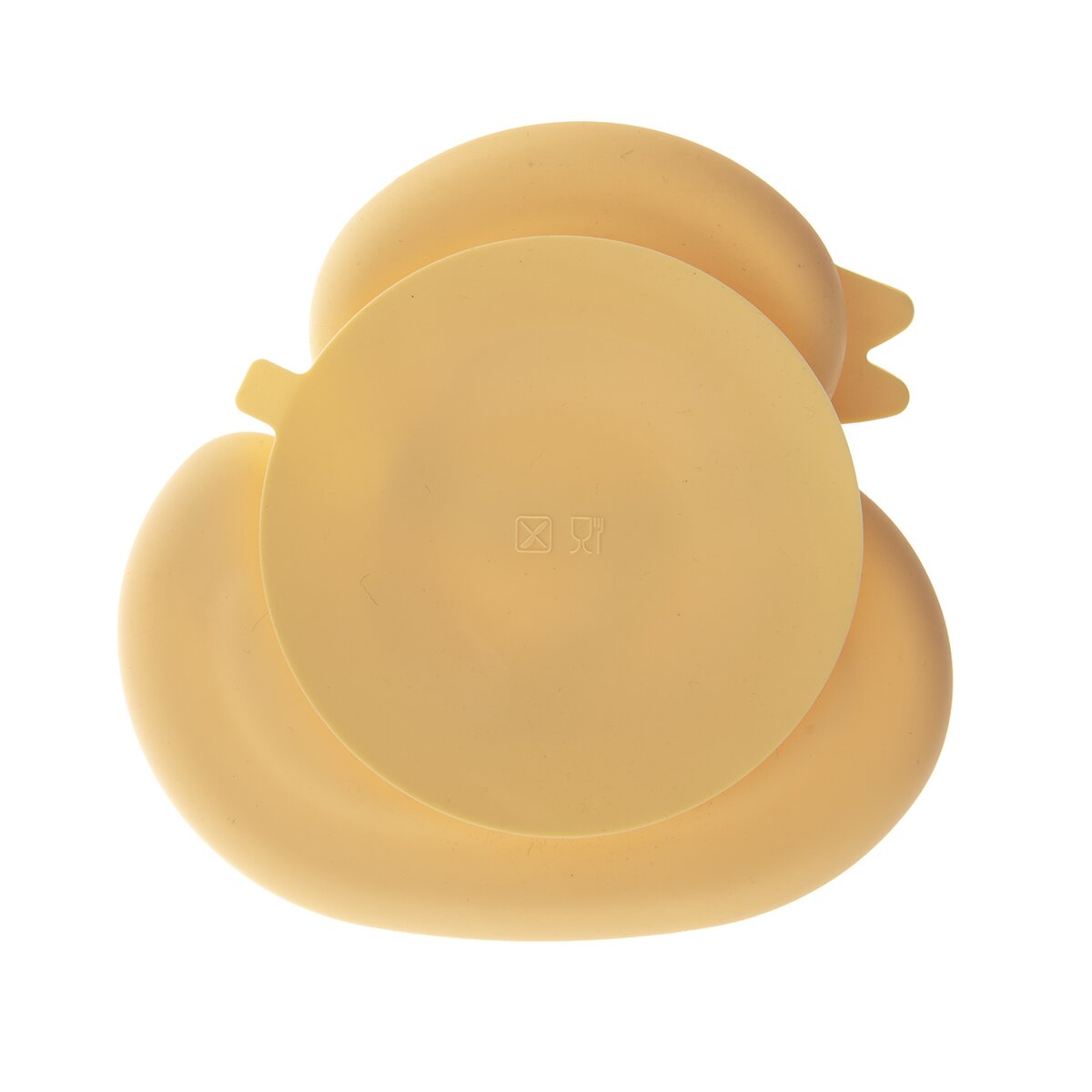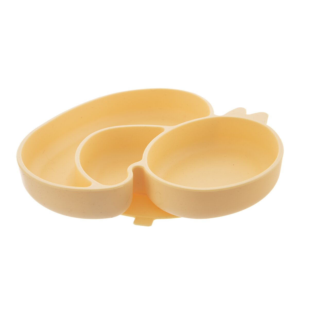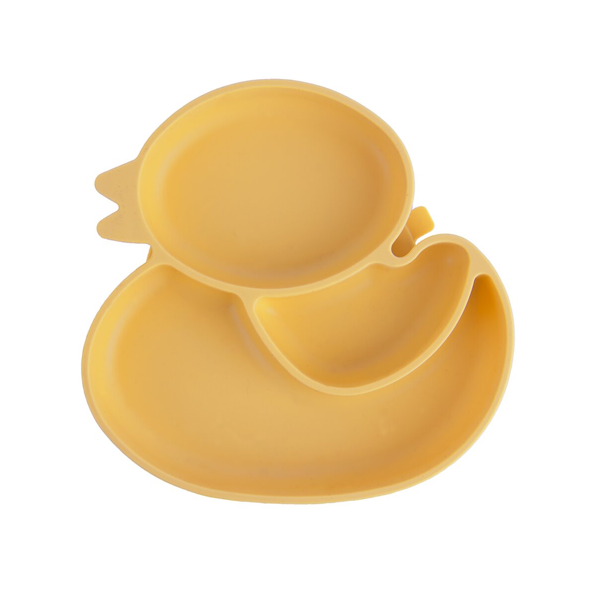 Kód produktu 129570Silikonový žlutý talíř je určen k podávání jídel malým dětem. Tvar kačenky je členěn na 3 sekce, velká přísavka navíc udrží talíř na místě.