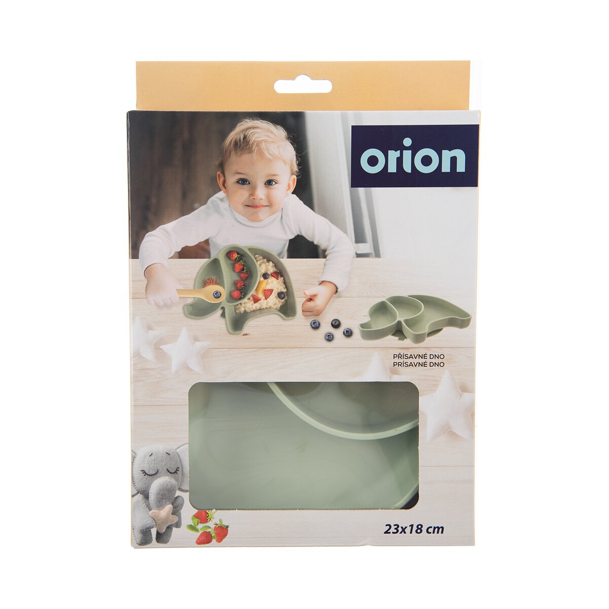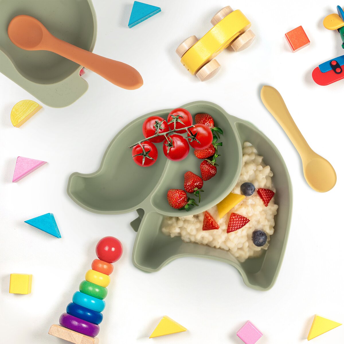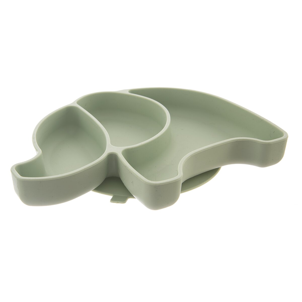 Kód produktu 129572Silikonový talíř v tlumené zelené barvě je určen k podávání jídel malým dětem. Tvar slona je členěn na 3 sekce, velká přísavka navíc udrží talíř na místě.