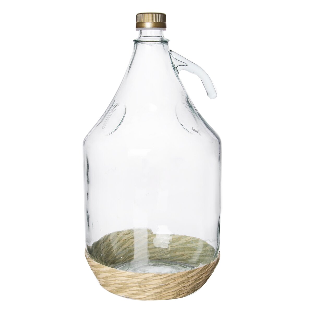 Kód produktu 127602Skleněný demižon o objemu 5 l s plastovým víčkem na závit a opleteným dnem z mořské trávy.