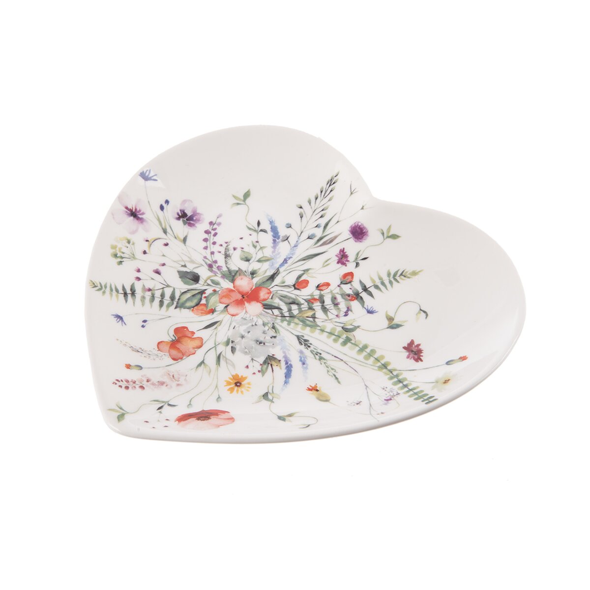 Kód produktu 129131Dezertní porcelánový talíř MÁK má tvar srdíčka a je zdoben něžným dekorem lučních květin.