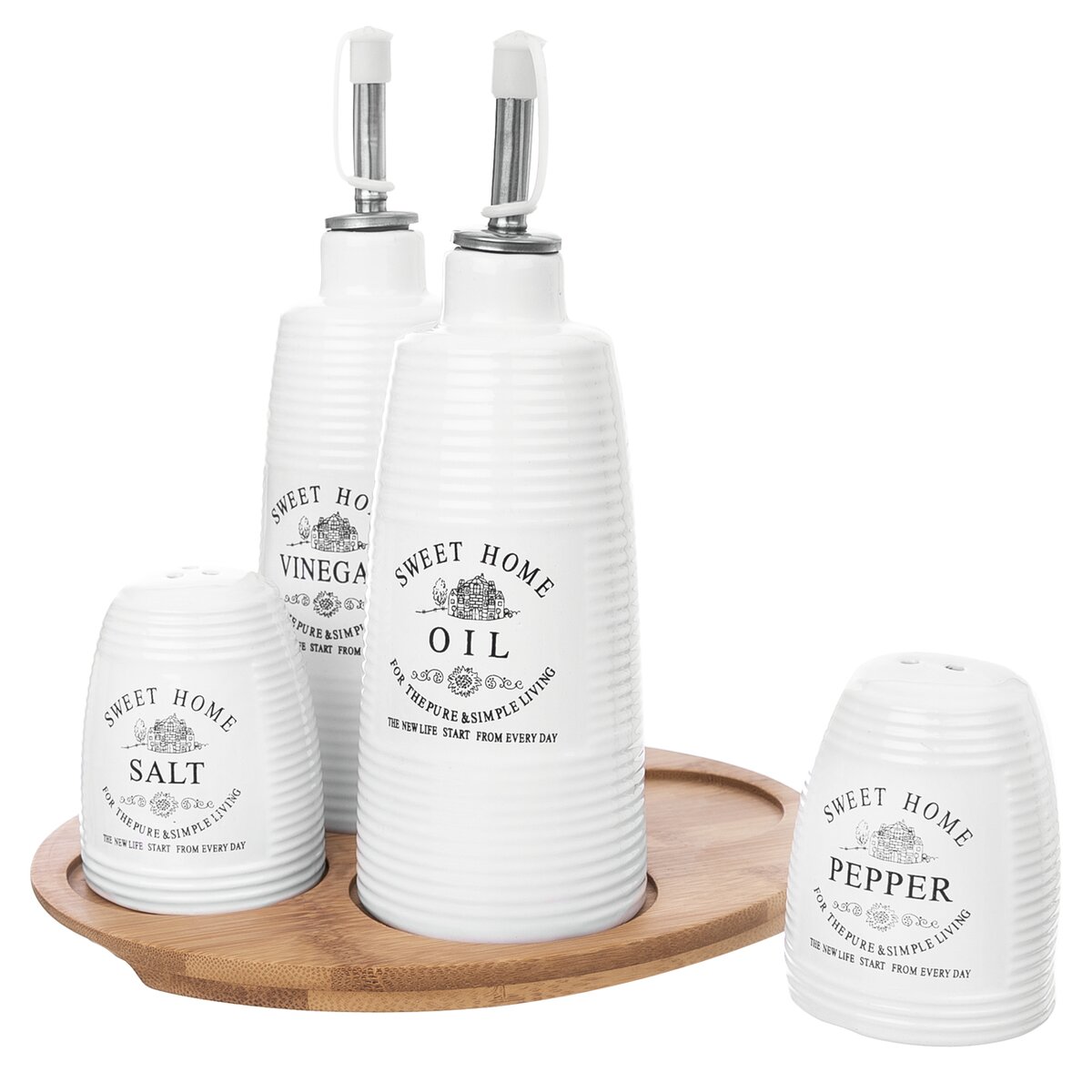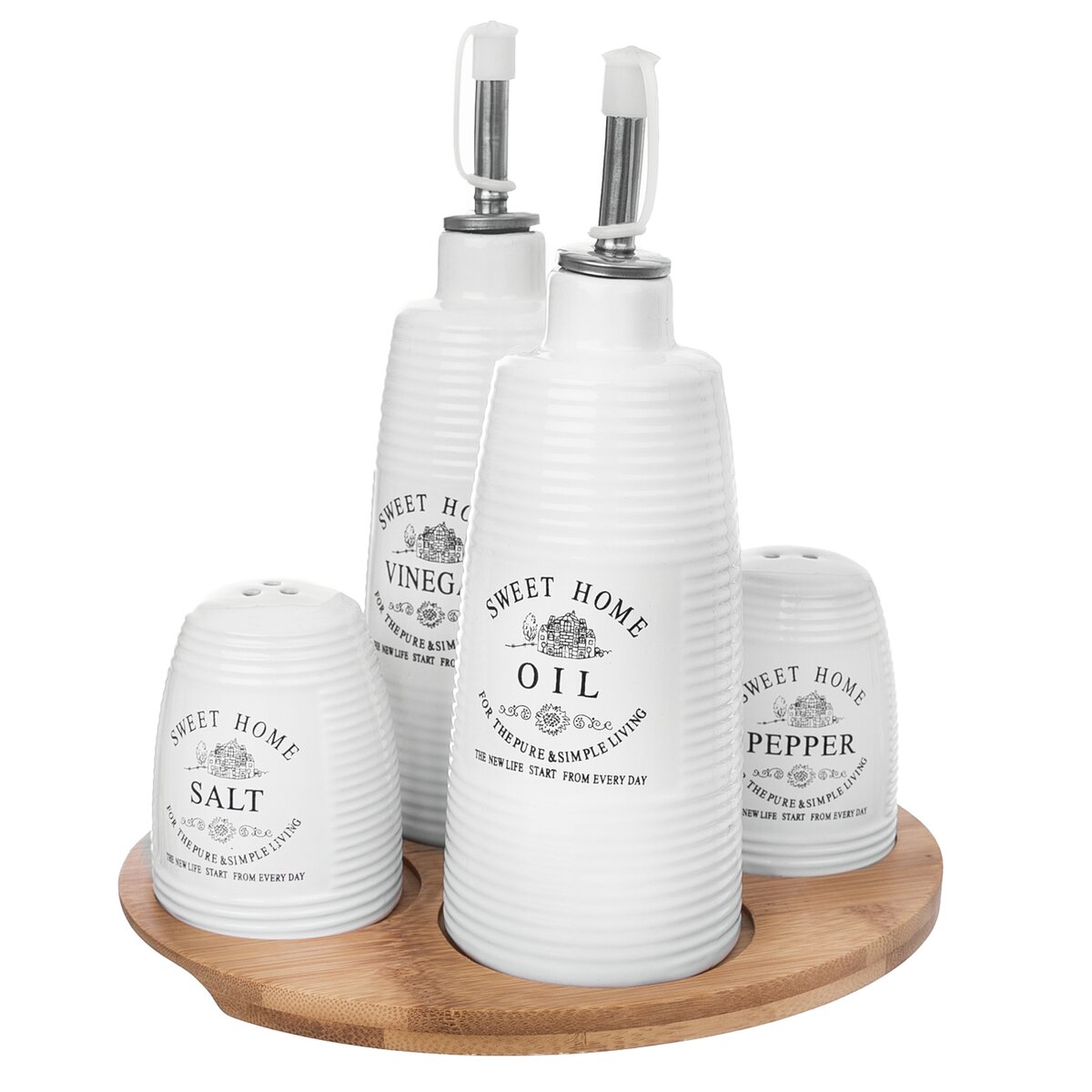 Kód produktu 152367Dochucovací souprava SWEET HOME je složená ze dřevěného podnosu o rozměrech 22×18 cm, dvou keramických kořenek o průměru 6 cm a dvou keramických lahví na olej a ocet o objemu 0,35 l.