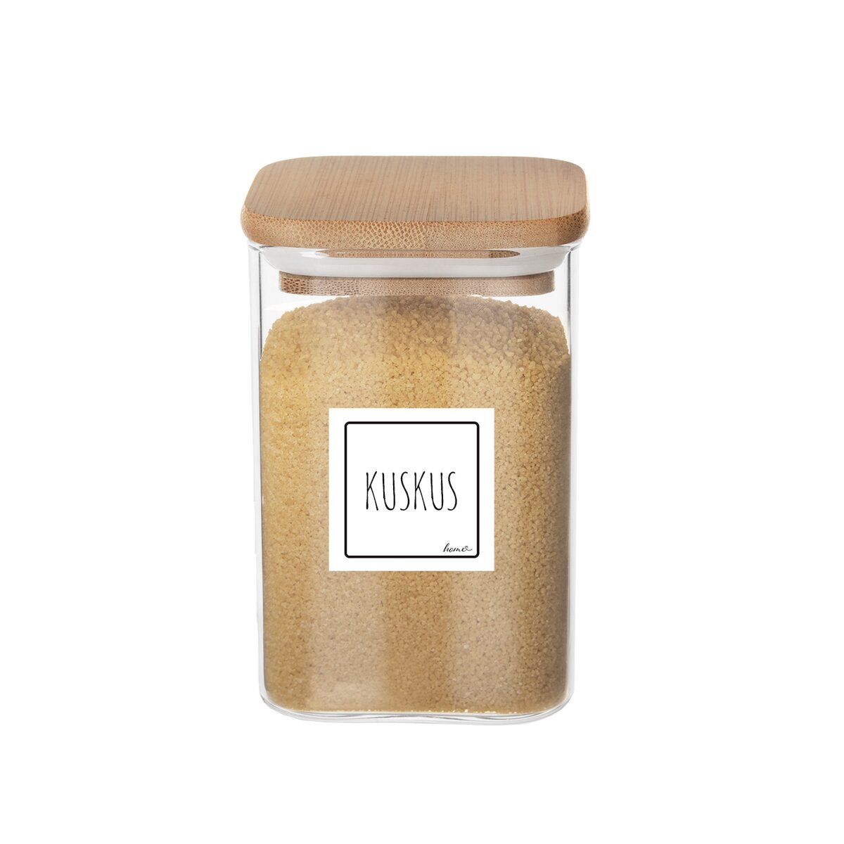 Kód produktu 127586Hranatá dóza z borosilikátového skla má celkový objem 1,3 l a je určena k uložení různých surovin v kuchyni. Pevné uzavření zajistí bambusové víčko se silikonovým těsněním.