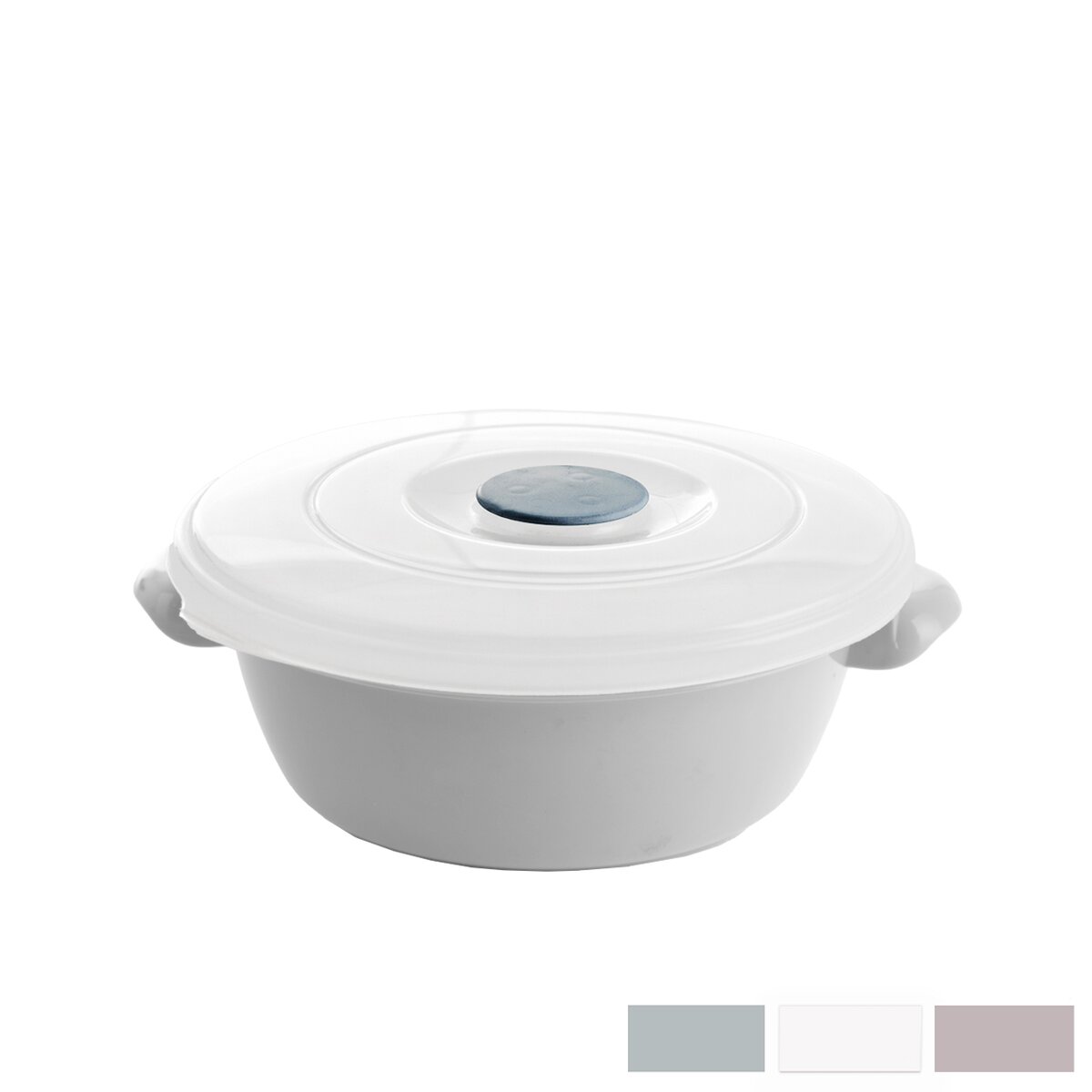 Plastová dóza kulatého tvaru určená k ohřevu v mikrovlnné troubě, ale která se také hodí na uskladnění a přenášení polévek, omáček, salátů a jiných pokrmů. Má objem 1,8 l a praktické transparentní víko, díky čemuž snadněji rozpoznáte obsah nádoby. Výhodou jsou také dvě ucha, která ulehčují její přenášení.