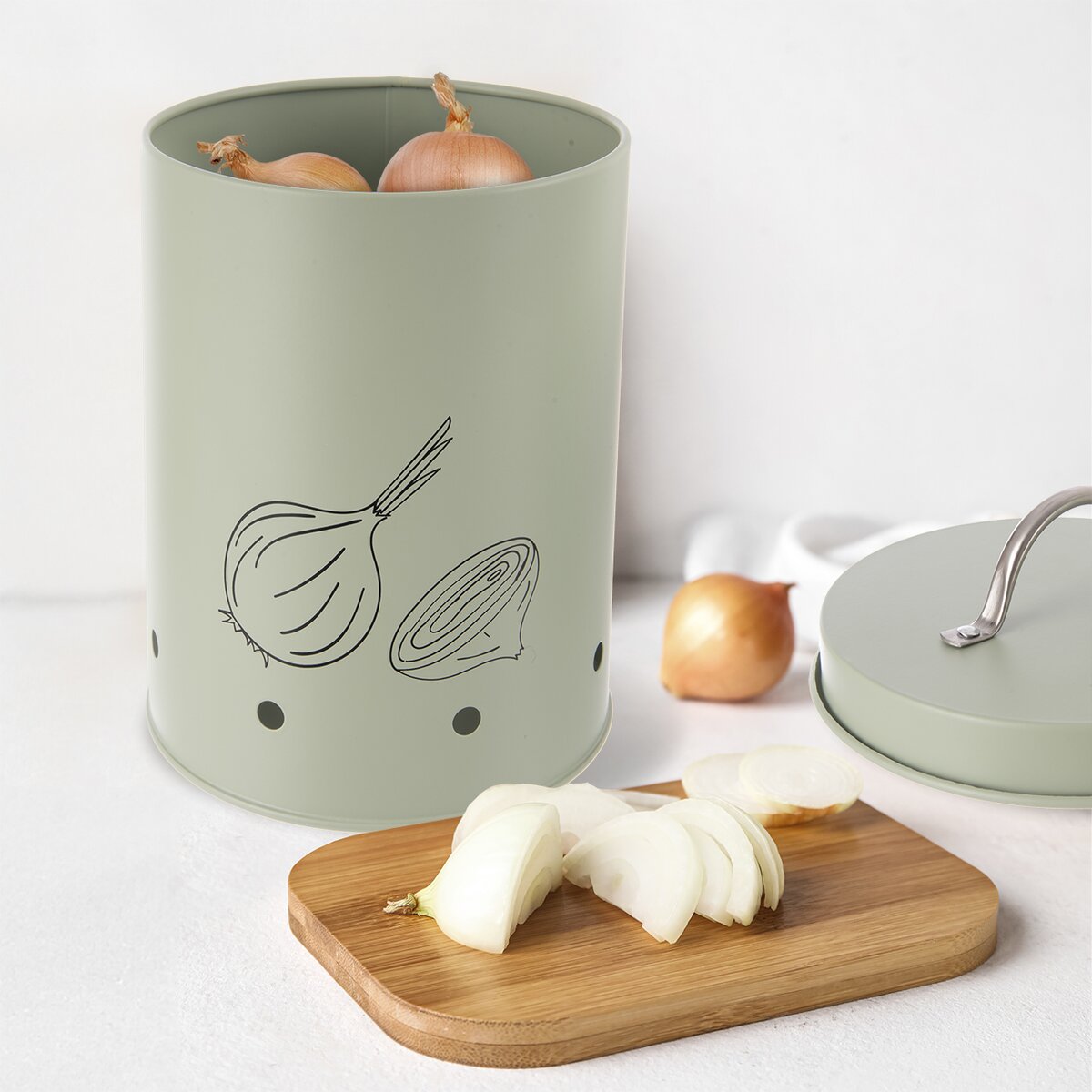 Kód produktu 127908Dóza GREENISH je určena k uložení cibule, bude tak správně skladována, navíc má otvory pro cirkulaci vzduchu a praktické víčko s držadlem.