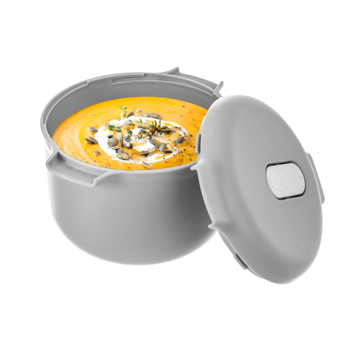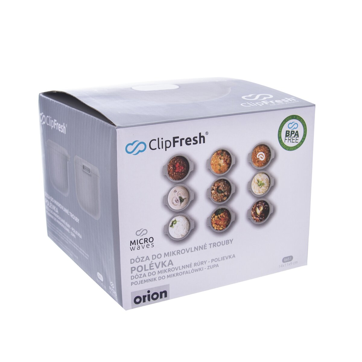 ClipFresh dóza na polévku s víčkem vám pomůže připravit polévku v MVT během několika málo minut. Víčko s ventilem pro postupné vypouštění páry. Materiál: kvalitní plast bez BPA. Vhodná do myčky na nádobí, MVT, chladničky i mrazničky (-20 °C až 120 °C). Rozměry: objem 0,65 l, 14x11x9 cm. Návod postupu je součástí balení.