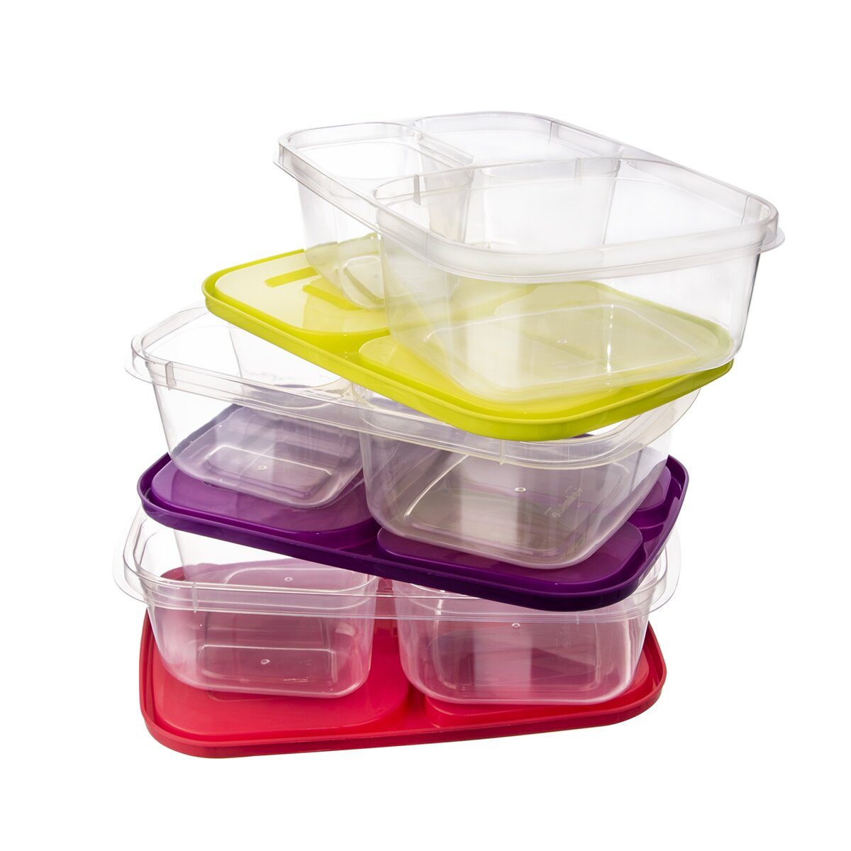 Kód produktu 127114Dóza s víčkem dělená na tři sekce skvěle uchová potraviny v chladničce i mrazničce (do -25 °C), jsou skvělé na přenášení potravin, lze v nich ohřívat jídlo v MVT (do +95 °C), můžete je použít do myčky na nádobí. Barevný assort víček. Materiál: plast. Rozměry: objem 2,2 l, 2 29x17,5x8 cm.