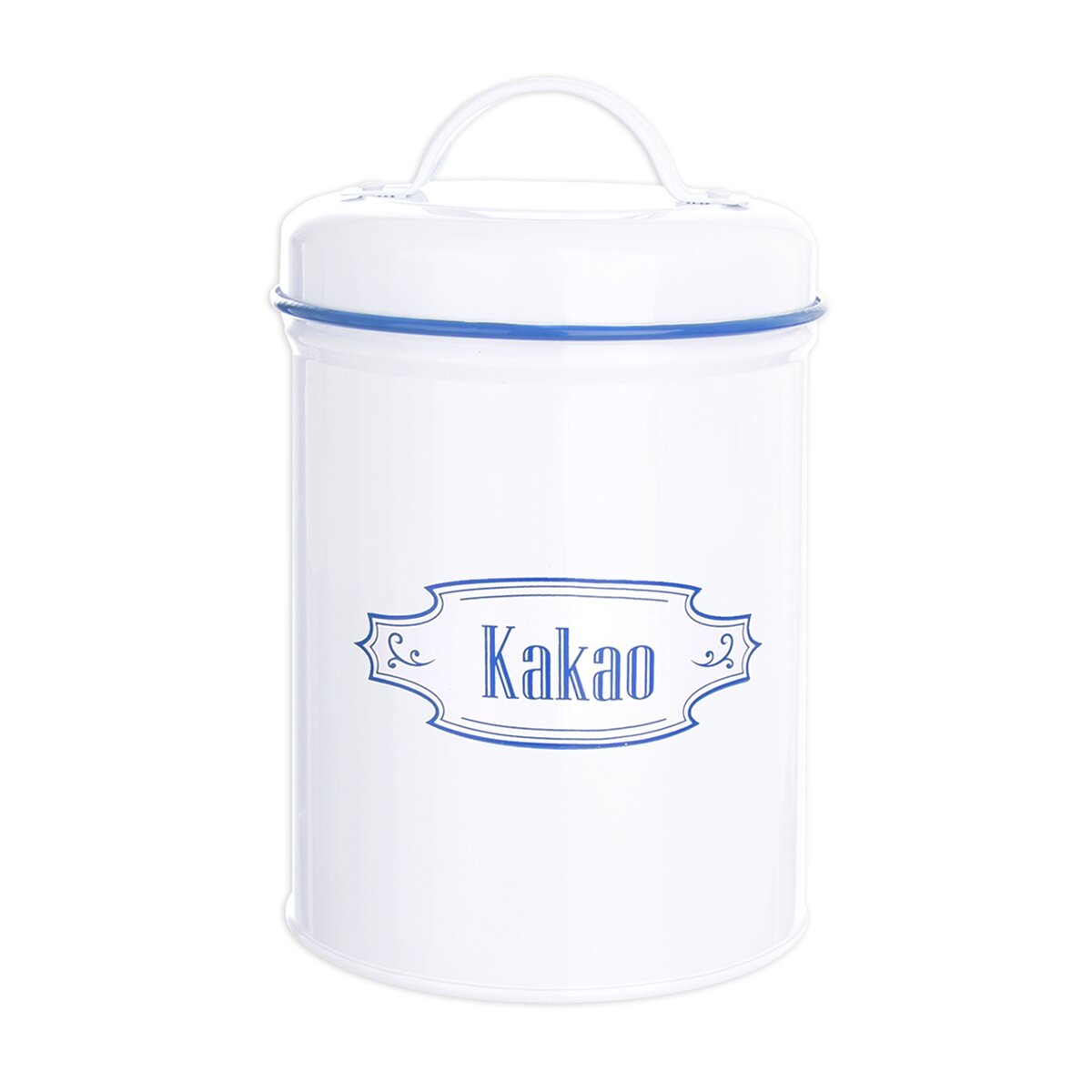 Kód produktu 153647Stylová kulatá plechová dóza s modrým nápisem KAKAO a praktickým víčkem.