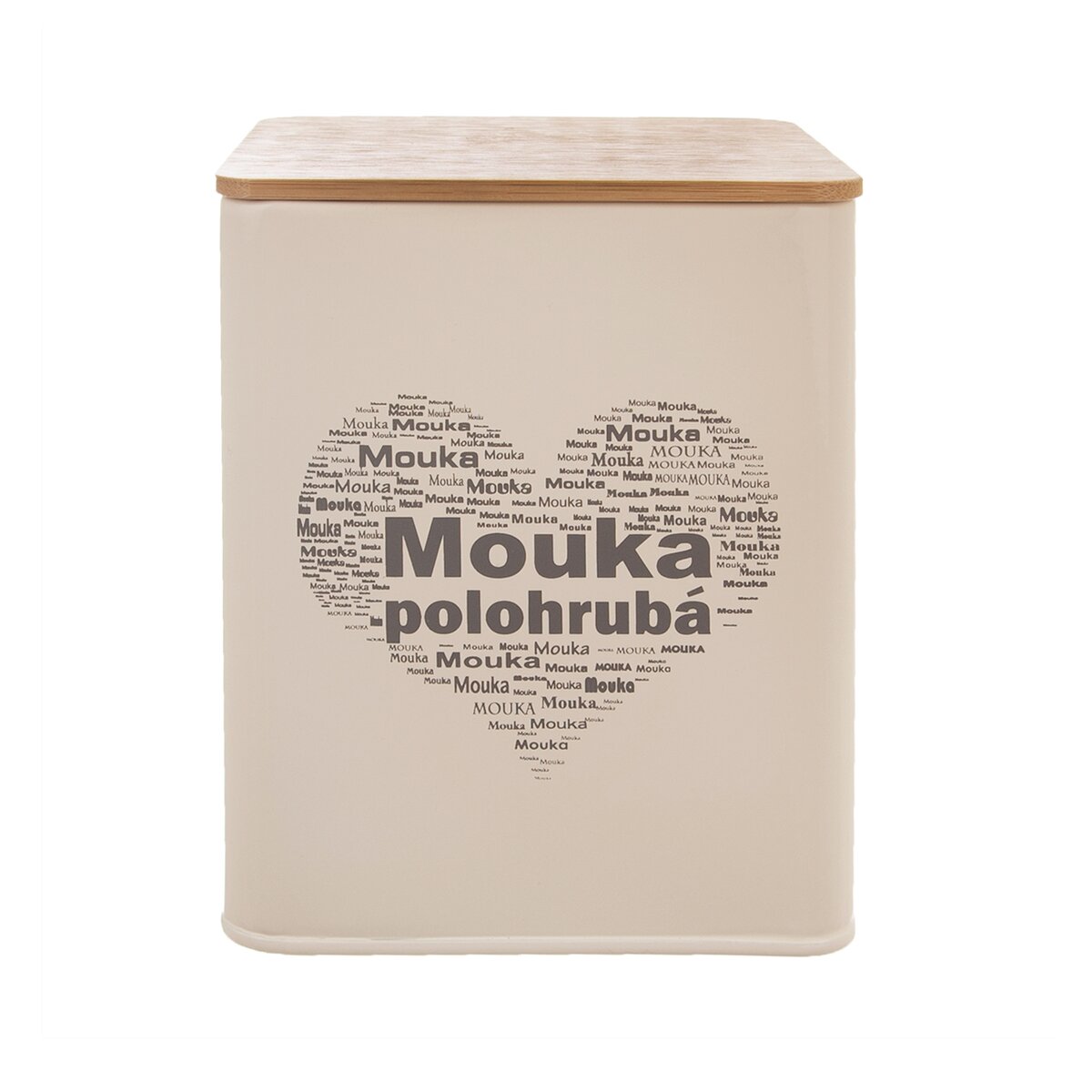 Kód produktu 153697Hranatá plechová dóza s designovým nápisem POLOHRUBÁ MOUKA ve tvaru srdce, uzavřená bambusovým víčkem. Nejen praktický, ale i designový kousek.