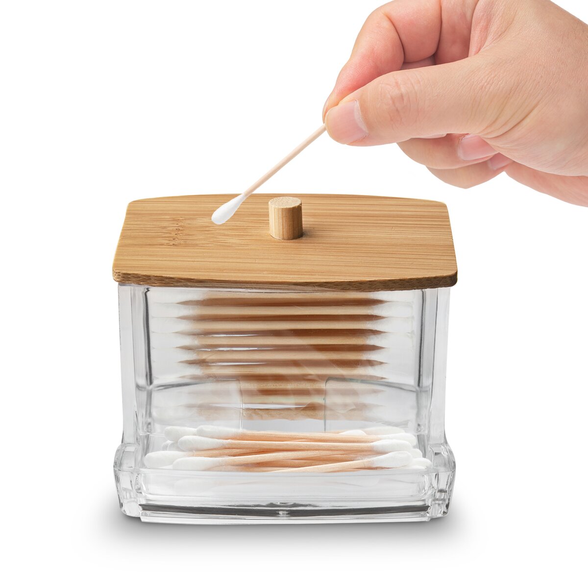 Kód produktu 127134Hranatá transparentní dóza na vatové tyčinky WHITNEY s bambusovým víčkem do každé koupelny nebo na kosmetický stolem.