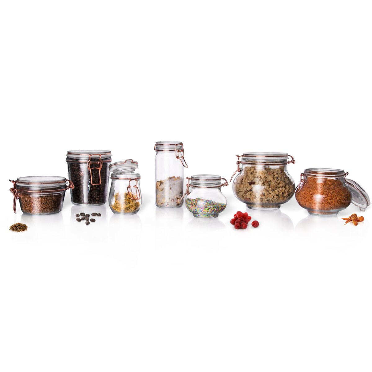 Dóza s pevným patentním uzavíráním a s těsněním. Materiál: sklo, silikonové těsnění, kovová přezka. Rozměry: objem 0,25 l, pr. 9 cm, v. 8,5 cm.
