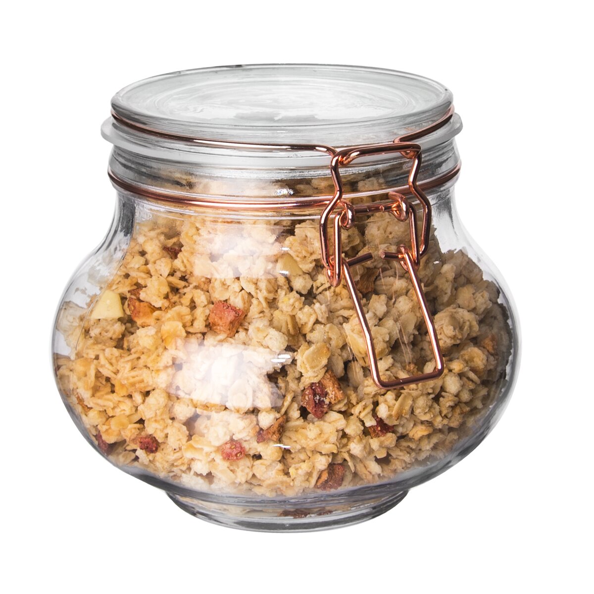 Dóza s pevným patentním uzavíráním a s těsněním. Materiál: sklo, silikonové těsnění, kovová přezka. Rozměry: objem 1,25 l, pr. 15 cm, v. 12,5 cm.