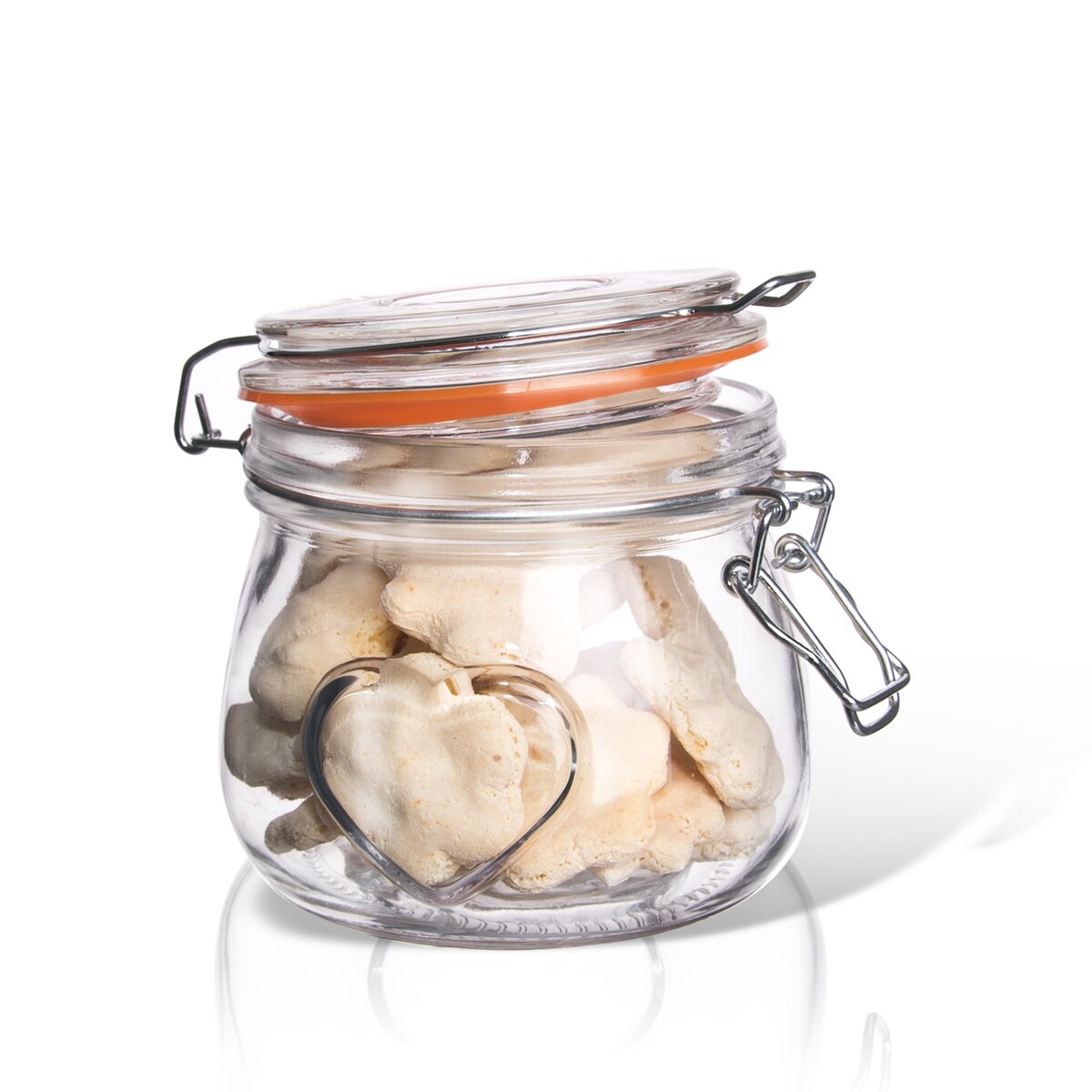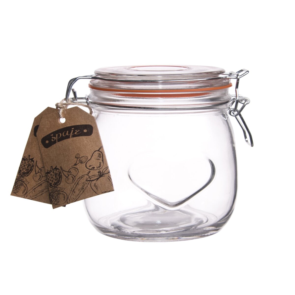 Kód produktu 126549Nakládací skleněná dóza BELA o objemu 0,5 l s dekorem srdce, kovovým patentem a silikonovým těsněním.