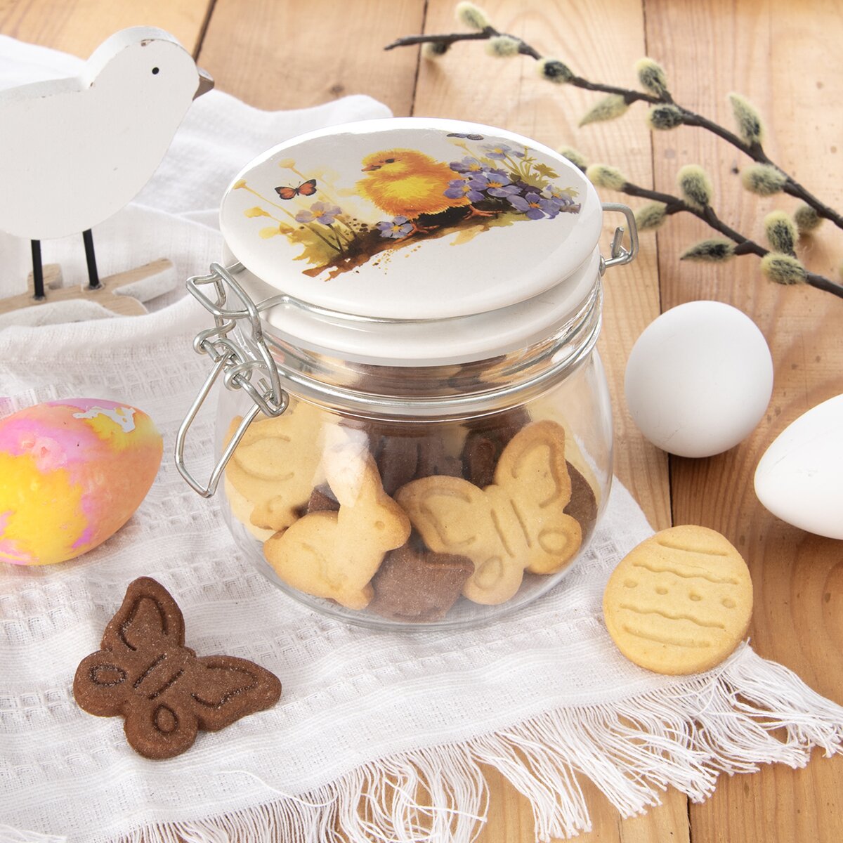 Kód produktu 127906Oblá skleněná dóza JARO je zdobena na keramickém víčku motivem roztomilého kuřátka a uzavírá se díky drátěnému klipu a silikonovému těsnění.
