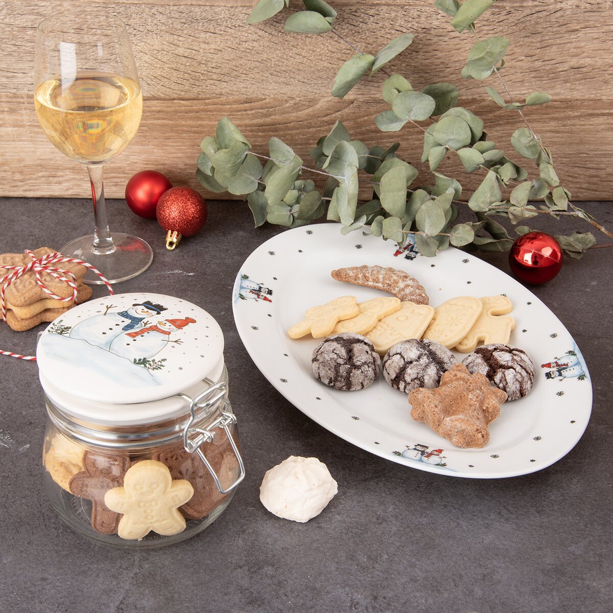 Kód produktu 127911Oblá skleněná dóza SNĚHULÁK je zdobena na porcelánovém víčku originálním motivem dvojice sněhuláků a uzavírá se díky drátěnému klipu a silikonovému těsnění.