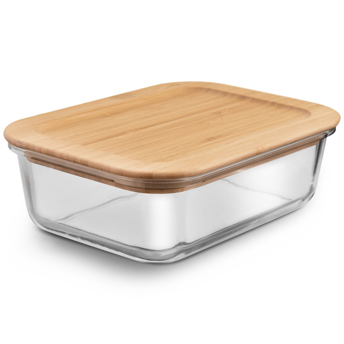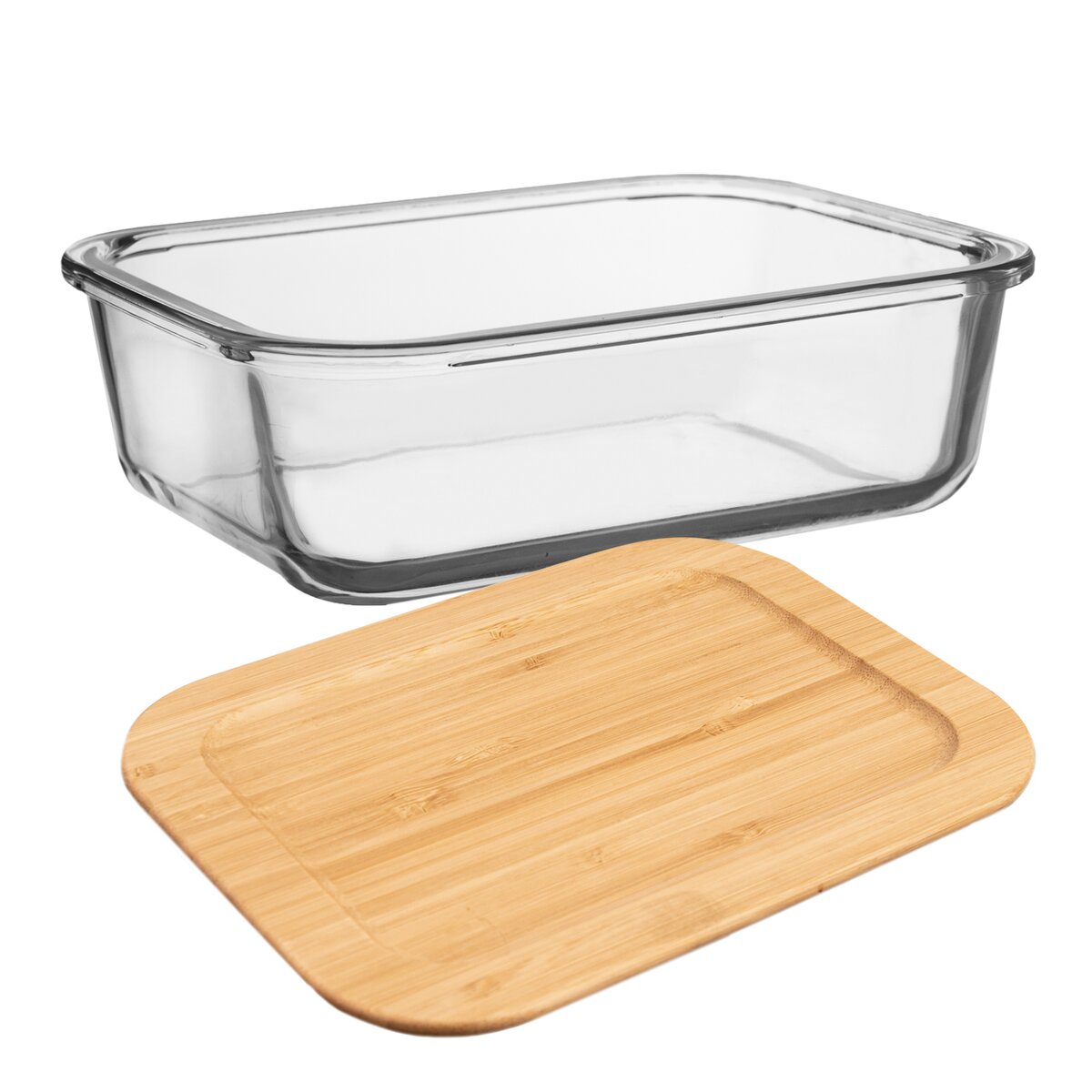 Kód produktu 127549Obdélníková dóza z borosilikátového skla o objemu 1,6 l, s bambusovým víčkem opatřeným silikonovým těsněním pro uložení, ohřívání i zapékání oblíbených pokrmů.