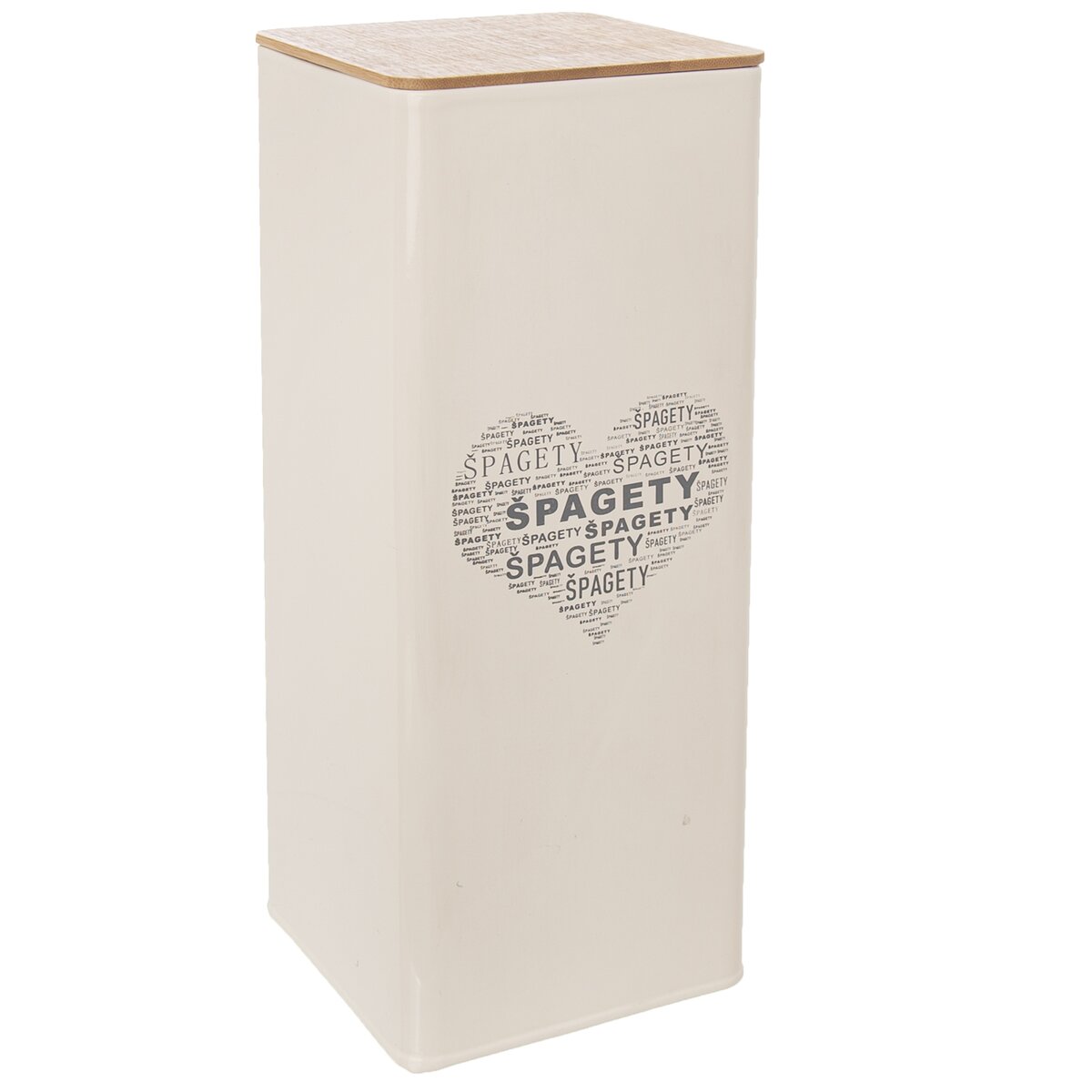 Kód produktu 127535Hranatá plechová dóza s designovým nápisem ŠPAGETY ve tvaru srdce, uzavřená bambusovým víčkem. Nejen praktický, ale i designový kousek ve smetanové barvě.