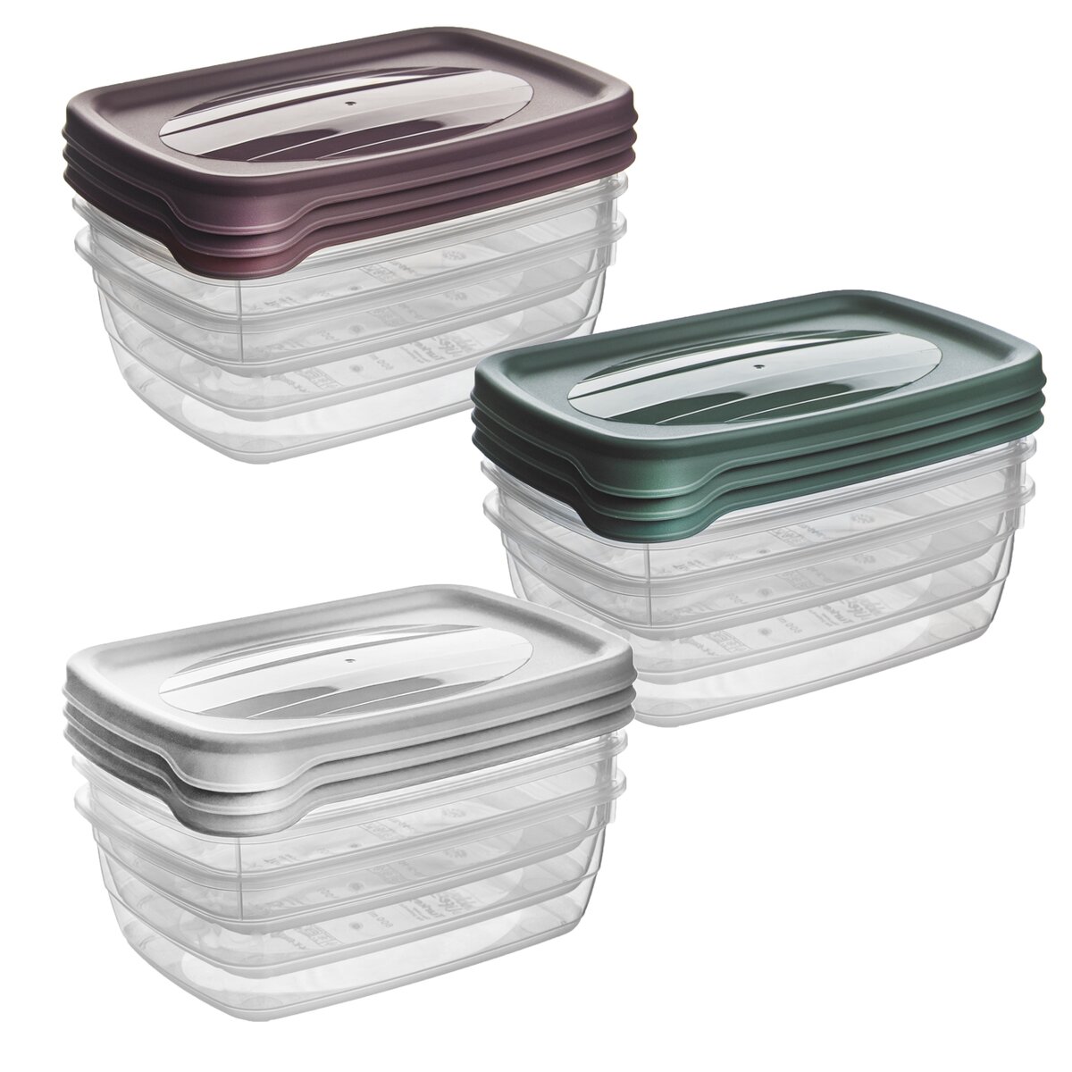 Kód produktu 124655Sada tří kusů plastových obdélníkových dóz TREND o objemu 0,3 l s barevnými víčky.