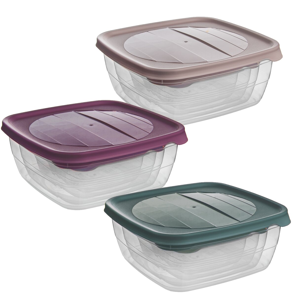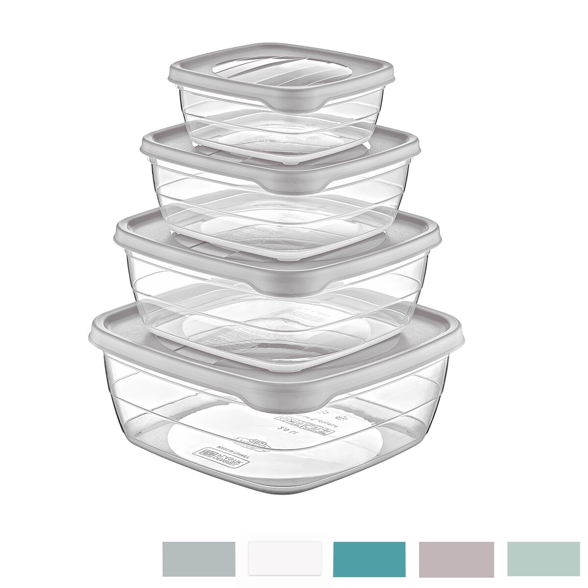 Kód produktu 127103Sada čtyř čtvercových plastových dóz TREND s barevnými víčky. Jejich objemy jsou 0,5 l, 0,9 l, 1,5 l a 2,5 l.