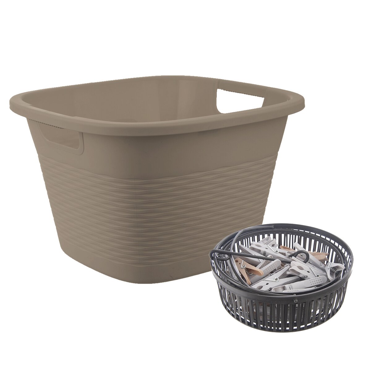 Kód produktu 720811Šedý plastový dřez LOOP se dvěma uchy, o velikosti 38x38x24 cm, ke vhodný na přenášení vypraného prádla a nejrůznějších drobností v domácnosti. Součástí sady je i DÁREK - závěsný košík s 50 ks prádelních kolíčků.