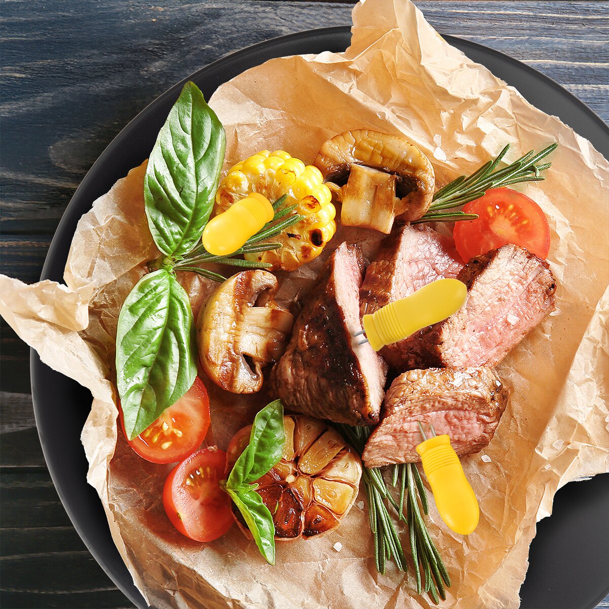 Držáky jsou v sadě 6 kusů, žlutá rukojeť je plastu PP+PE, slouží k servírování, nikoliv k tepelné přípravě. Po použití je stačí umýt v teplé vodě se saponátem. Pozor, mají ostré hroty.