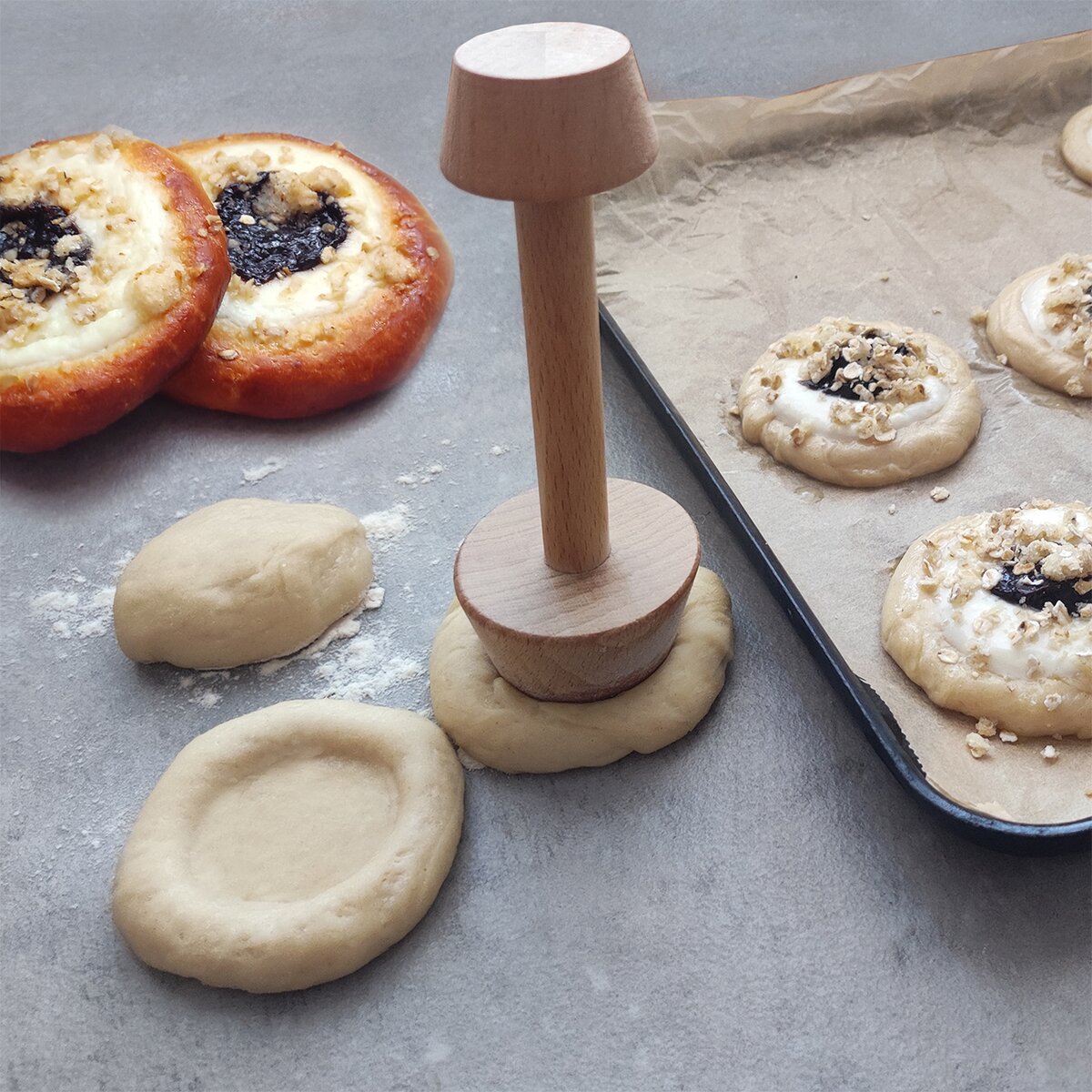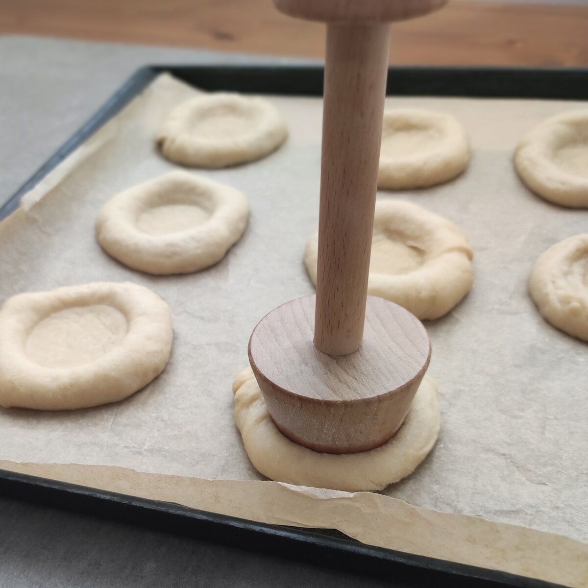 Kód produktu 121035Důlkovač z bukového dřeva s dvěma stranami pomůže vytvořit z vykynutého těsta důlky uprostřed koláčů, které stačí naplnit oblíbenou náplní.