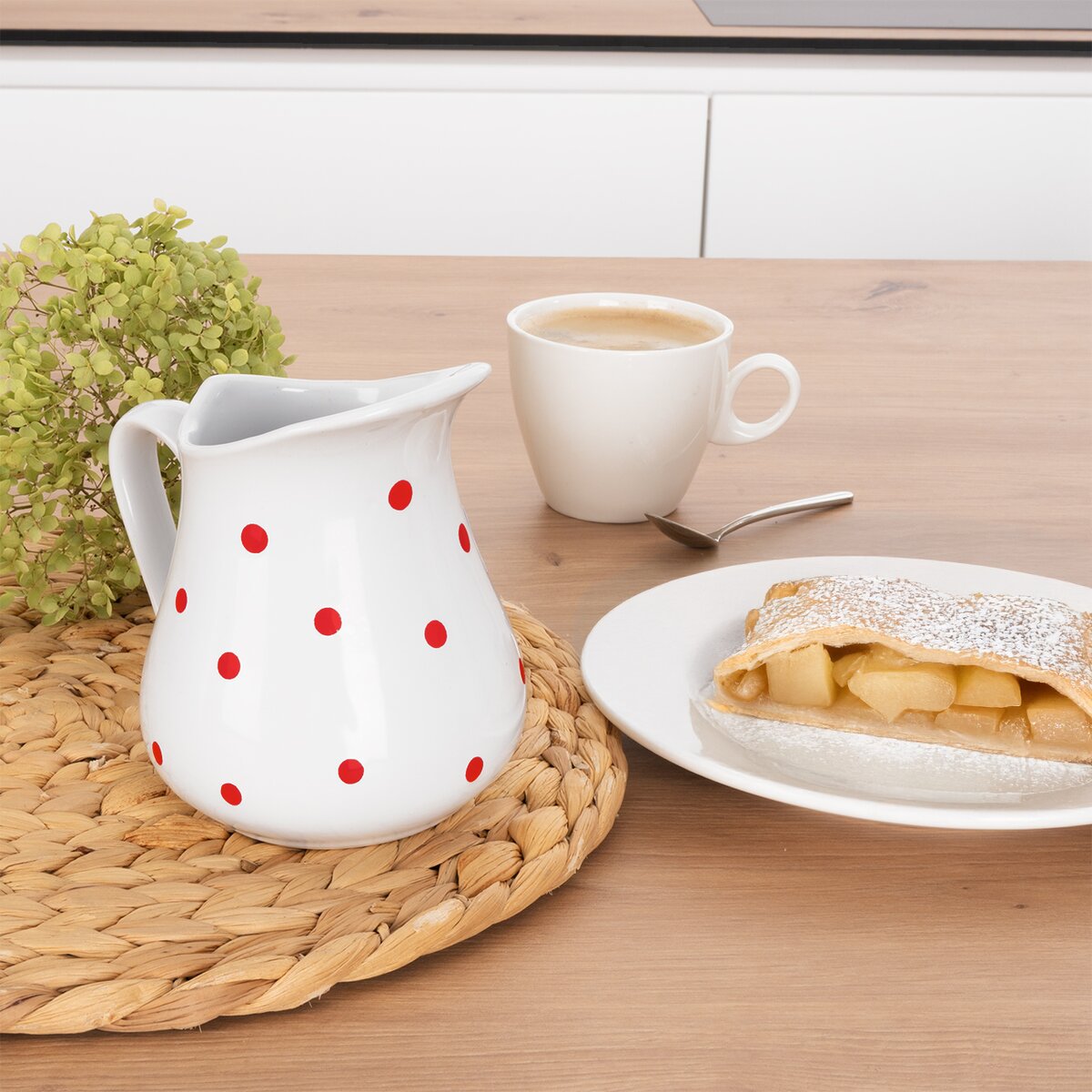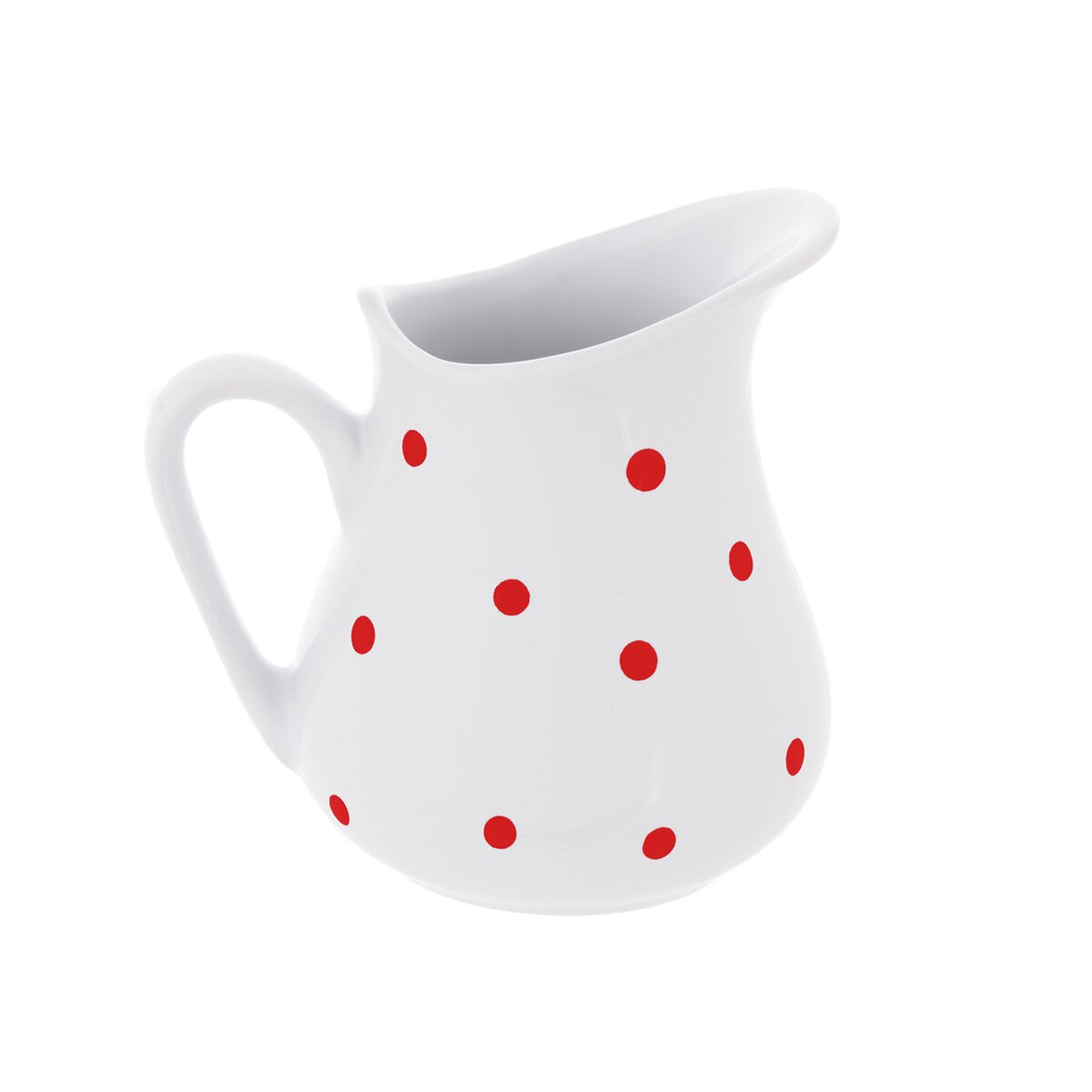 Kód produktu 126686Stylový keramický bílý džbánek s červenými puntíky na mléko, limonádu nebo jako originální váza.