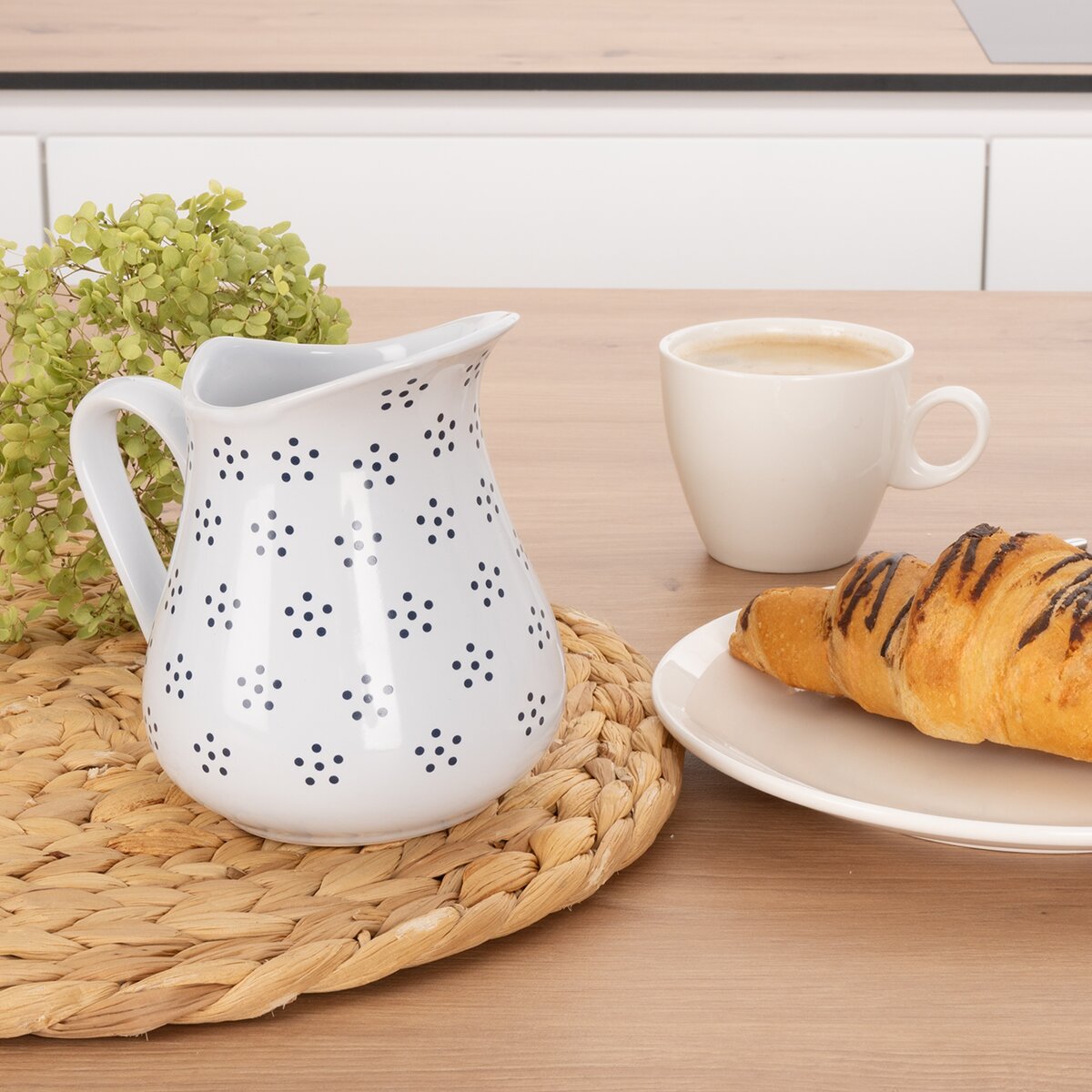 Keramický džbánek s modrými kvítky je praktický a zároveň stylový doplněk, který se skvěle hodí pro podávání mléka, smetany nebo domácích limonád. Jeho hravý design z něj dělá nejen funkční nádobu pro každodenní použití, ale i dekorativní prvek, který vynikne na jídelním stole, v kuchyni nebo třeba na polici. Výborně poslouží i jako originální váza na čerstvé nebo sušené květiny. Džbánek je vyroben z kvalitní keramiky. Jeho šířka s uchem je 13,5 cm.