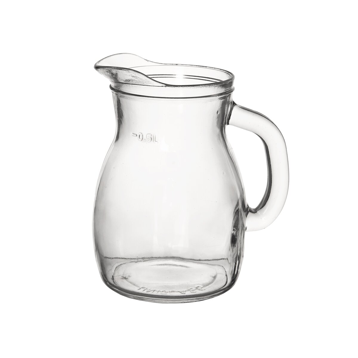 Čirý zaoblený džbán o celkovém objemu 0,6 l, s viditelnou mírou 0,5 l a výlevkou pro pohodlné a přesné nalévání nápojů do sklenic a pohárů.