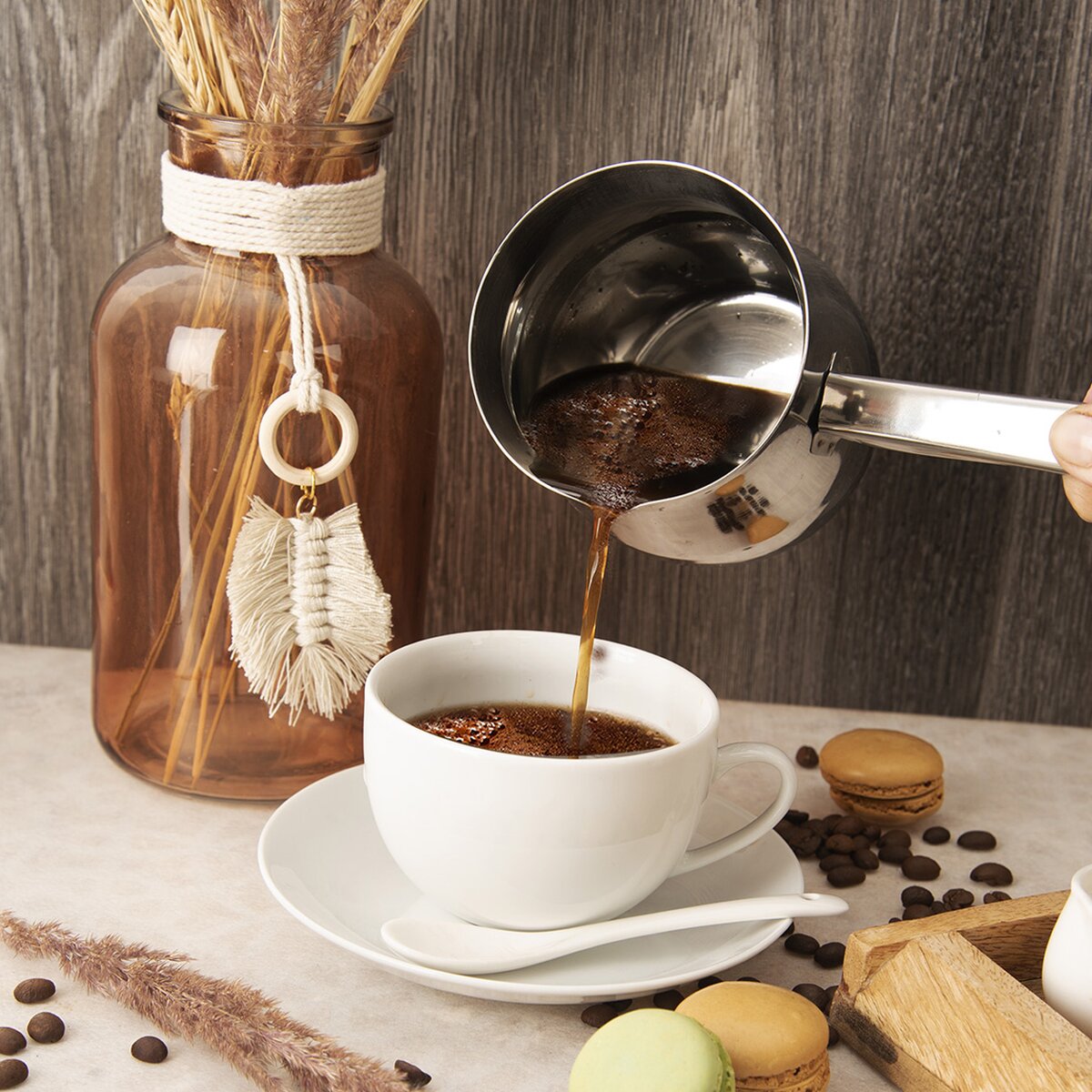 Nerezová džezva NESO o objemu 400 ml se hodí k přípravě pravé turecké kávy. Horní okraj nádoby je rozšířen do tzv. límce, který zabraňuje přetékání kávy při jejím vzkypění.