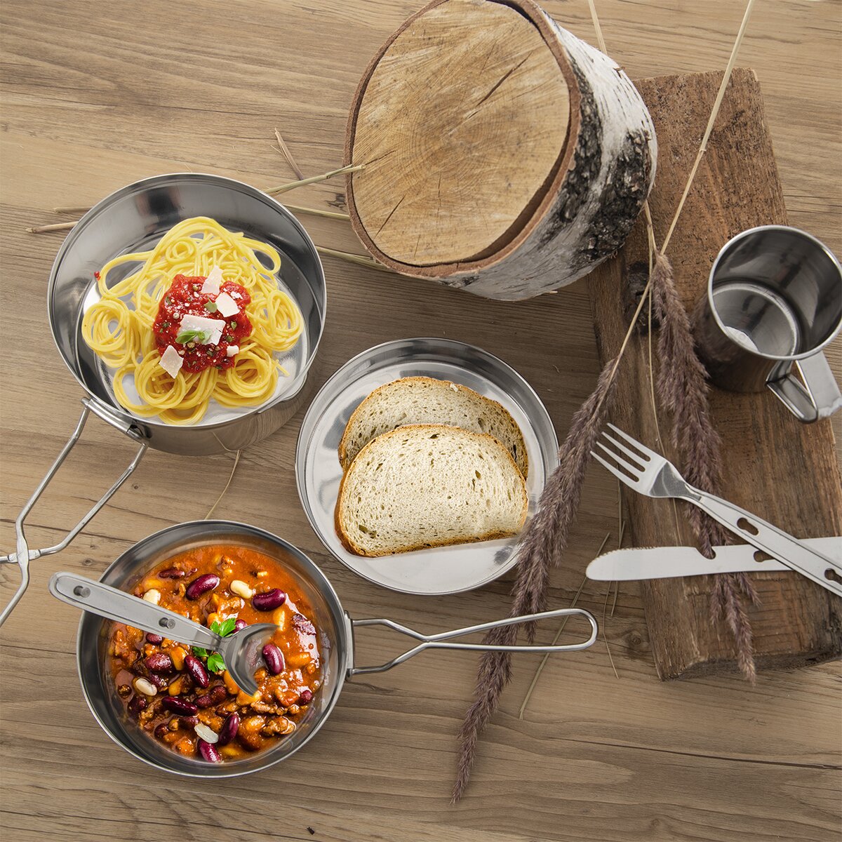 Dva nerezové ešusy o objemech 1,5 l a 0,9 l s víkem jsou nezbytnou součástí pro táboření v přírodě. Tato outdoorová sada nádobí navíc obsahuje nerezový hrnek a praktické skládací příbory. Vychutnejte si poctivý guláš z kotlíku nebo jídlo z táborové kuchyně – na čerstvém vzduchu chutná nejlépe. Pozor, ešus není určen na ohřívání jídla.