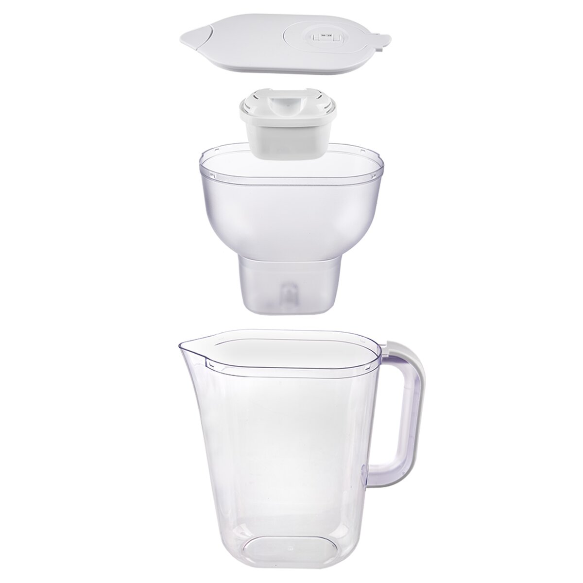V konvici je manuální indikátor životnosti filtru. Je vyrobená z kvalitního transparentního plastu SAN, bílé víčko je z plastu ABS. Konvice splňuje požadavky na výrobky určené ke styku s pitnou vodou.