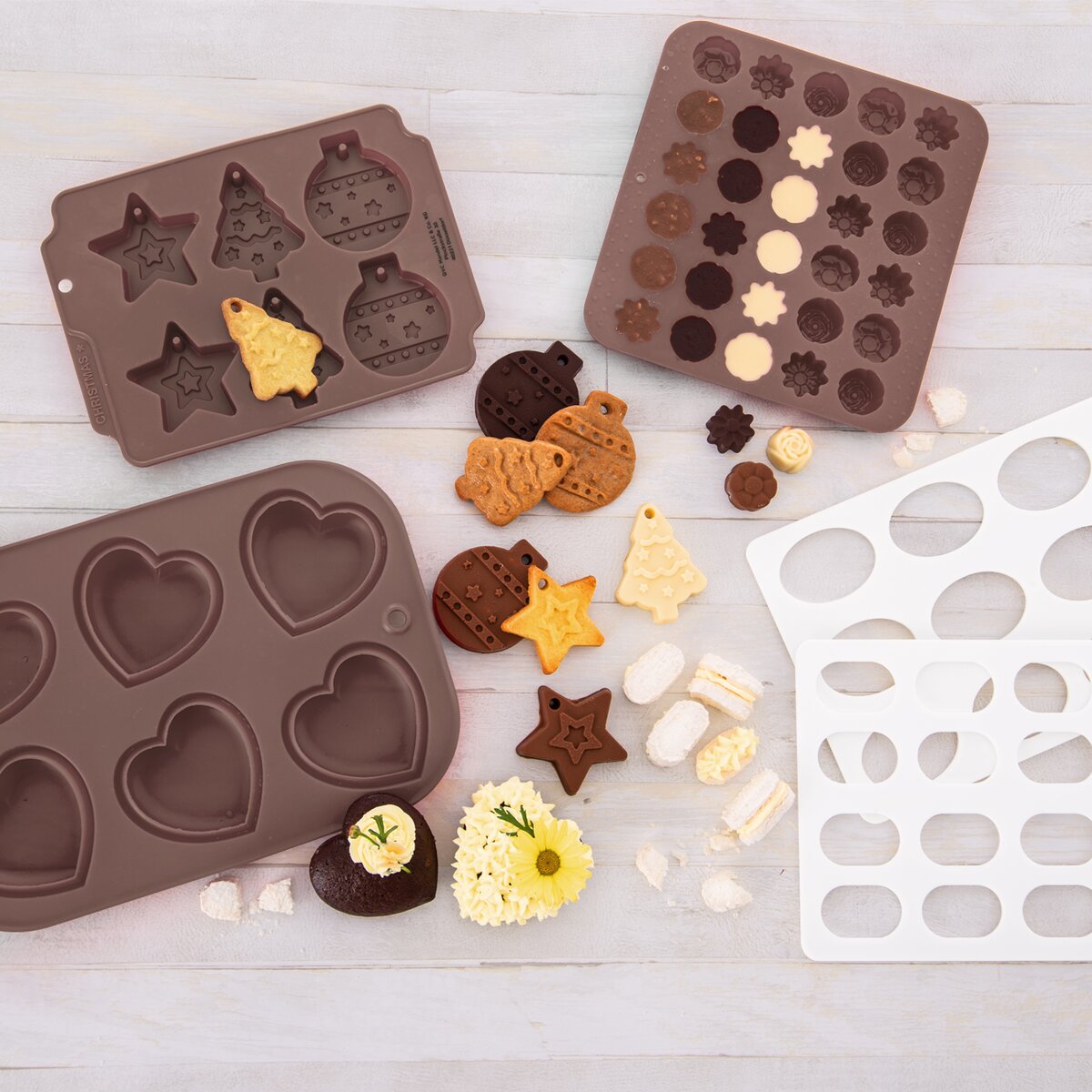 Stačí rozpuštěnou čokoládu nalít, přidat vaše oblíbené ingredience, ořechy, sušené ovoce, sušenou levanduli apod. a nechat ztuhnout v ledničce. Pak je z pružné formy jednoduše vyloupnete. Nebo ji použijte na pečení drobných máslových sušenek ke kávě.