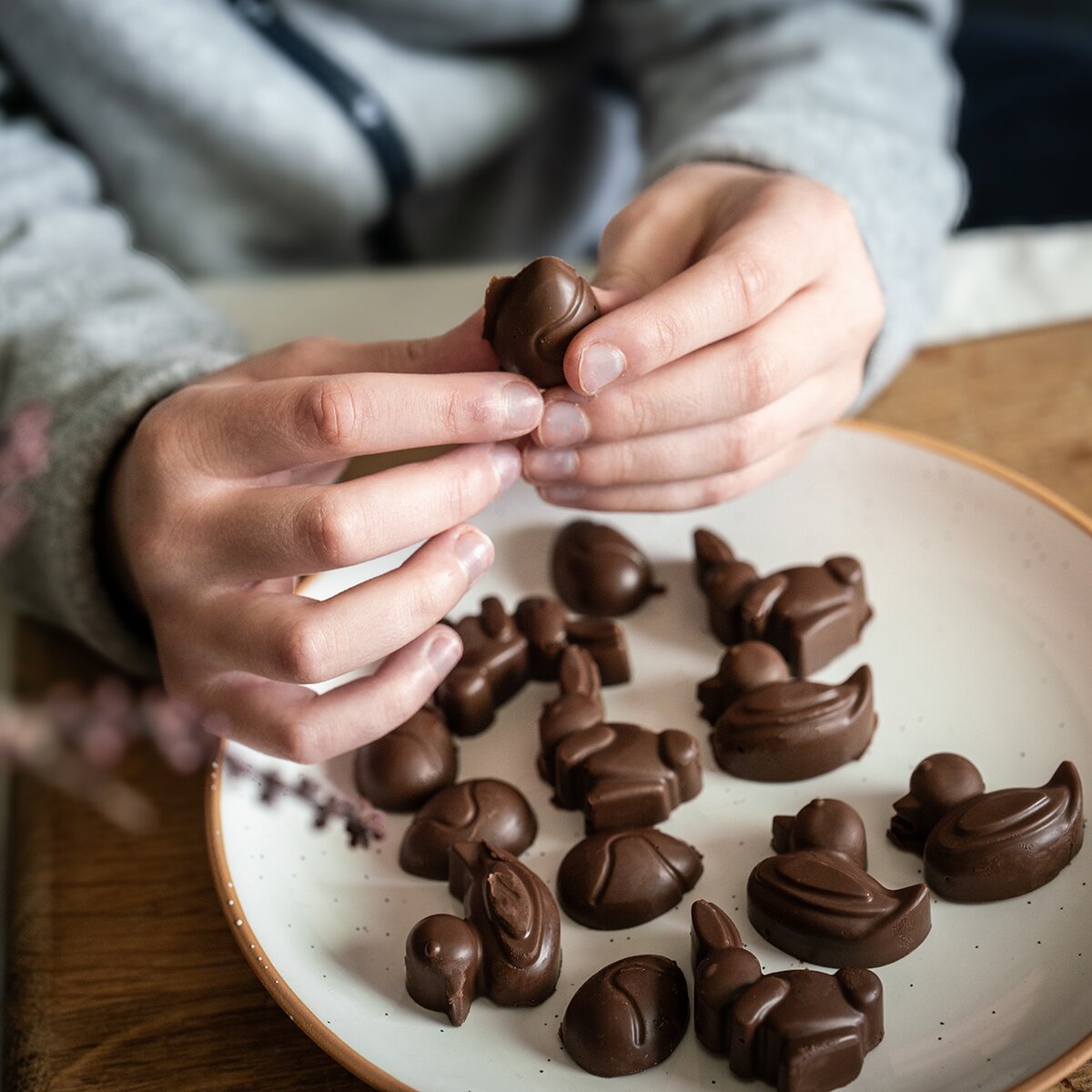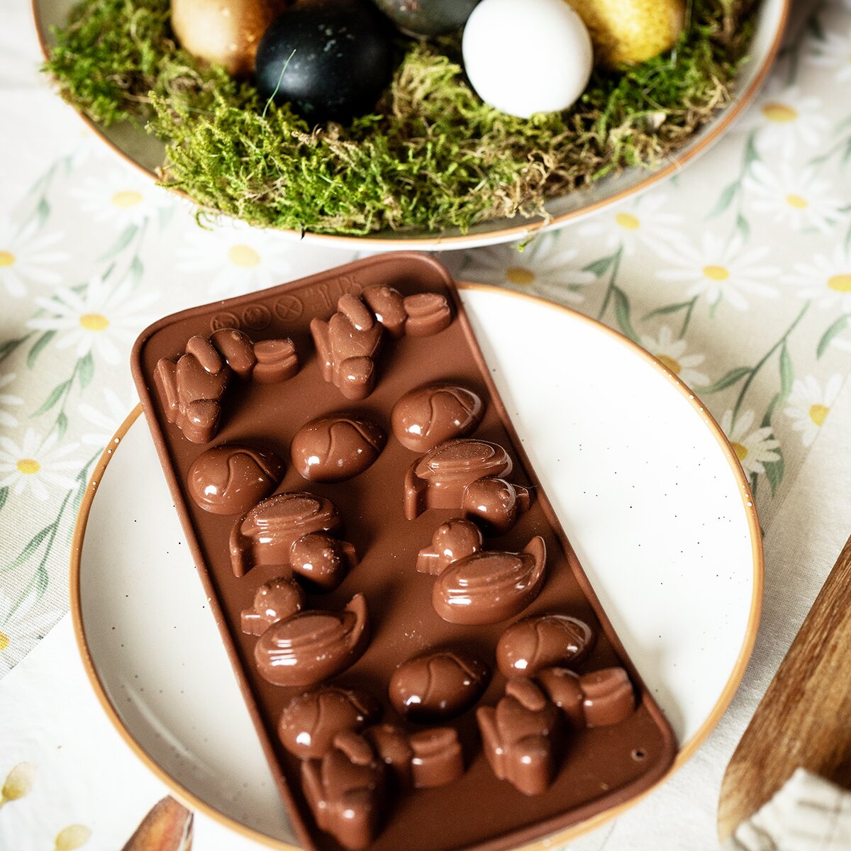 Stačí rozpuštěnou čokoládu nalít, přidat oblíbené ingredience, ořechy, sušené ovoce, sušenou levanduli apod. a nechat ztuhnout v ledničce. Jednotlivá vajíčka, zajíčky a kačenky z pružné formy jednoduše vyloupnete. Nebo ji použijte na pečení drobných máslových sušenek ke kávě pro vaši milovanou polovičku.