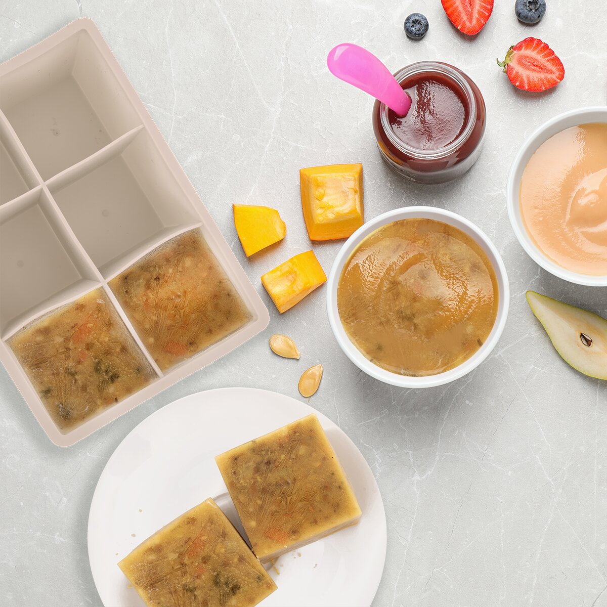 Tuto formu v kávové barvě lze použít k výrobě čistých kostek ledu, případně je lze doplnit čerstvým ovocem nebo mátou, ale hodí se i k mražení pesta z bylinek, strouhané zeleniny do polévky nebo dětských příkrmů.