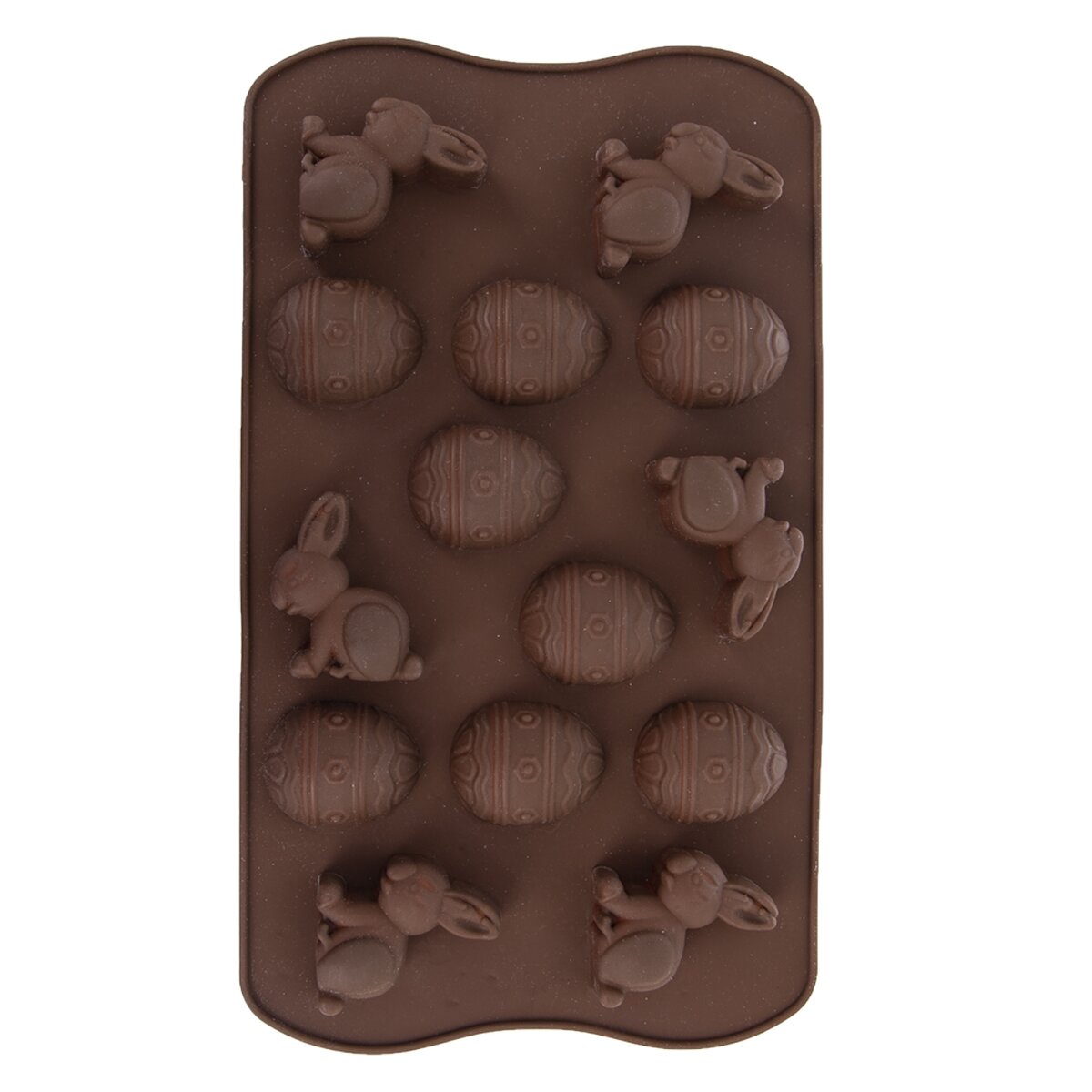Kód produktu 151748Nepřilnavá velikonoční hnědá silikonová forma pro rychlé a stejnoměrné pečení 14 ks sušenek ve tvaru zajíčků a vajíček nebo k výrobě originálních pralinek.