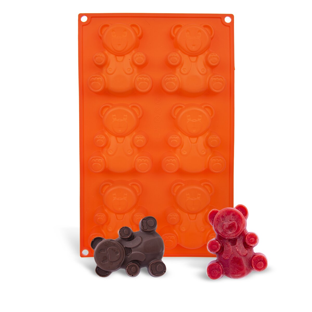 V nepřilnavé silikonové formě na pečení můžete upéct z piškotového nebo litého těsta nadýchané medvídky, plněné marmeládou či čokoládou. Můžete v nich také zapéct domácí müsli nebo připravit ovocnou dřeň či smetanový krém, který dáte zmrazit.
