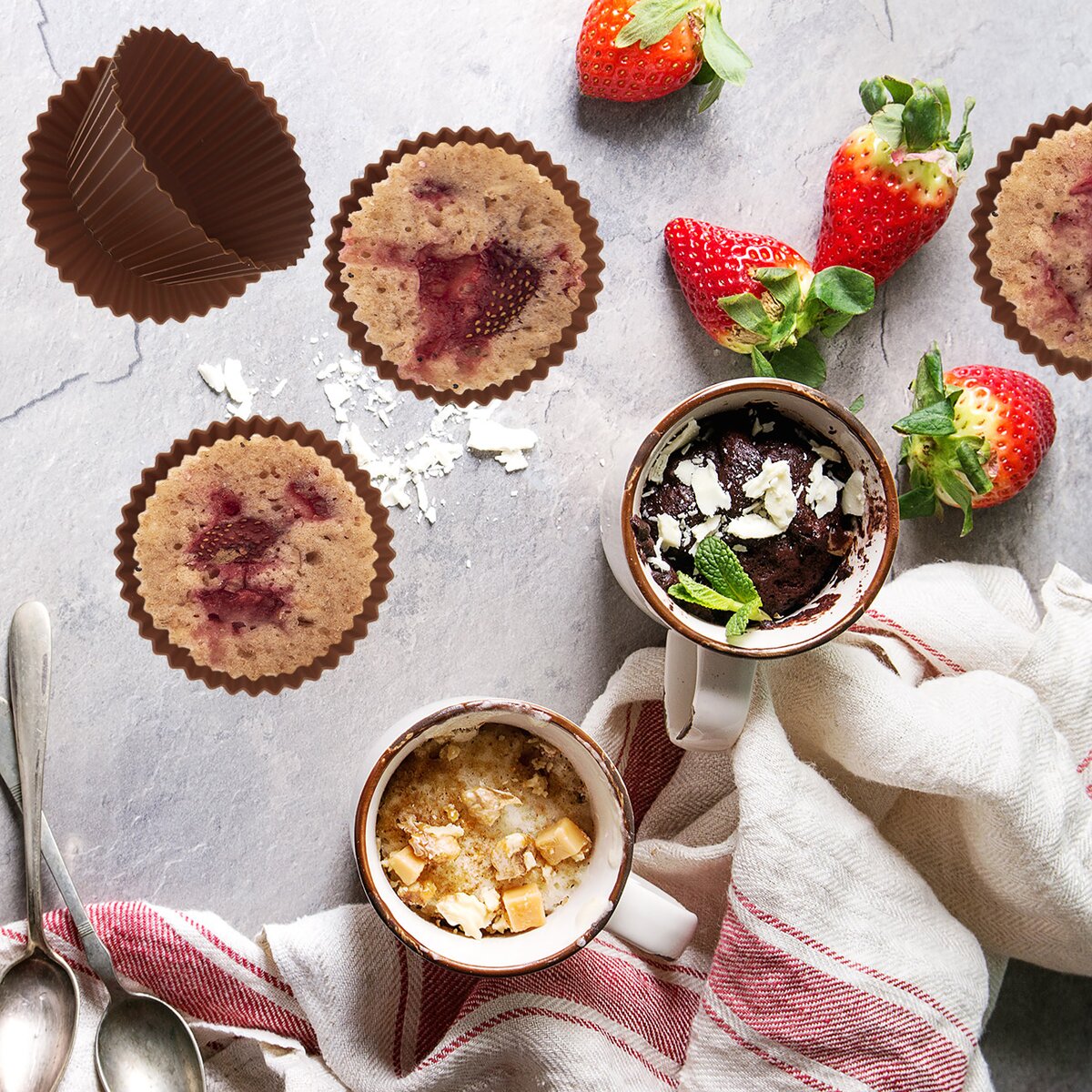 Díky kvalitním a praktickým hnědým silikonovým formám bude pečení snadnější. Lze je použít i na přípravu ovocných košíčků, suflé nebo osvěžujícího sorbetu. Formy jsou vyrobené z odolného, žáruvzdorného silikonu, určeného pro styk s potravinami. Průměr dna košíčků je 4,5 cm.