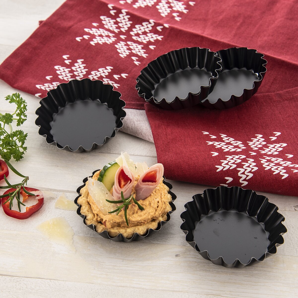 Kód produktu 123216Malé formy o průměru 11 cm s nepřilnavým povrchem jsou určené pro lahodné křehké tartaletky, plněné ovocné košíčky, minipizzy, aspiky i paštiky.