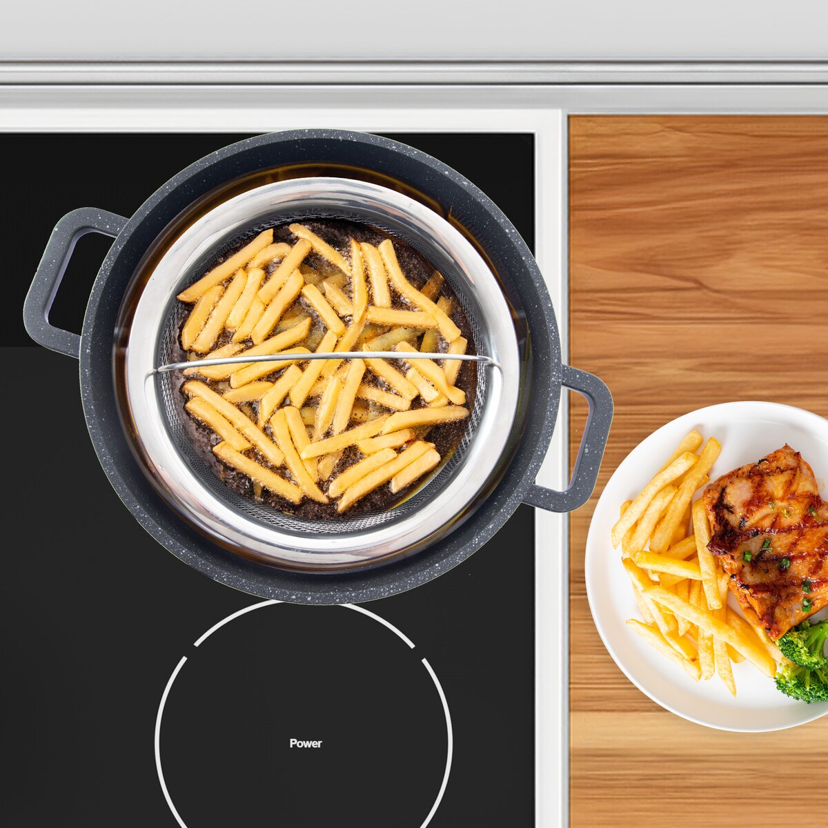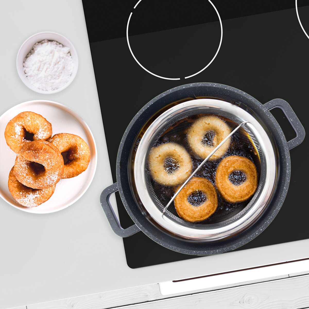 Více informacíCelonerezový košík s rukojetí je vhodný k smažení, fritování, ale i vaření nebo cezení hotových pokrmů. Ať už chcete fritovat hranolky, krokety, smažit kuřecí nugetky, cibulové kroužky, žampiony nebo domácí koblížky, stačí jej vložit i s potravinou do rozpáleného oleje v hrnci, podle potřeby vše promíchat nebo otočit a pak vyjmout za zvednuté držadlo s pomocí chňapky. Snadno z něj díky sklopné rukojeti smažené dobroty vysypete.