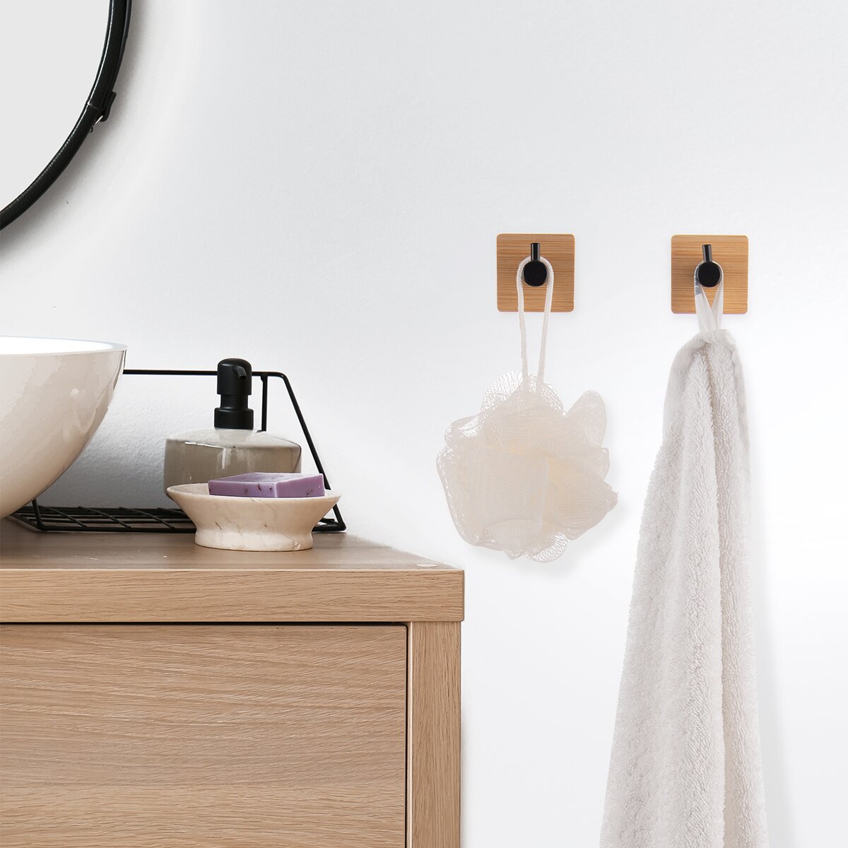 Kód produktu 834729Hranatý bambusový háček v sadě 2 kusů má lepicí spodní vrstvu, díky které není třeba vrtat do zdi nebo jiného hladkého povrchu.