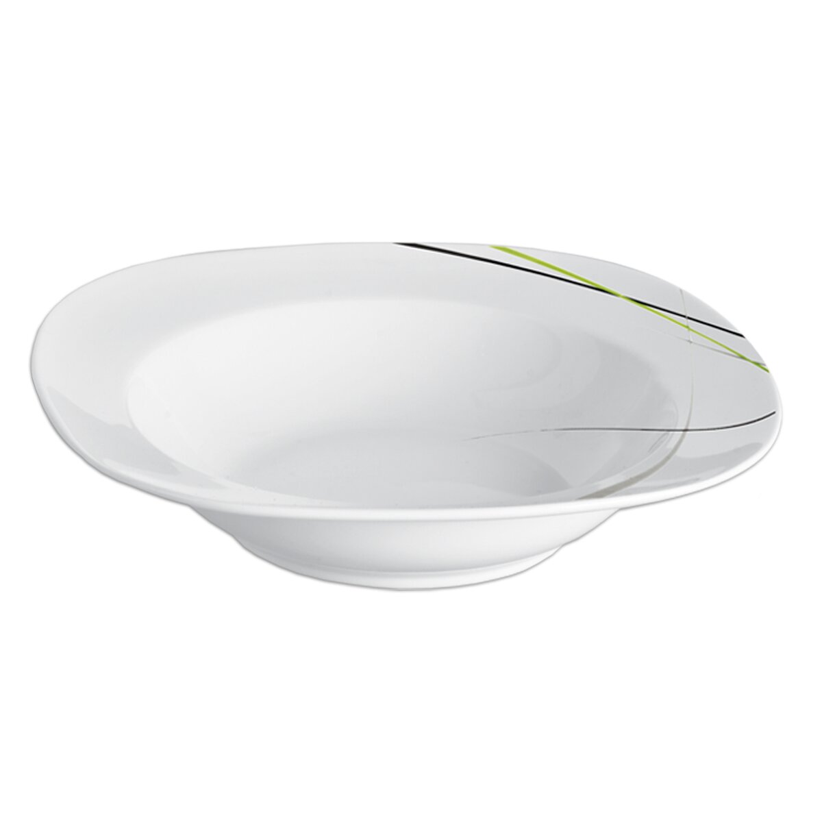 Hluboký talíř hranatého tvaru na polévky, saláty či těstoviny. Má rozměry 21×21 cm a je vyrobený z kvalitního porcelánu. Kraj talíře zdobí černo-zelený dekor v podobě několika jemných linií.