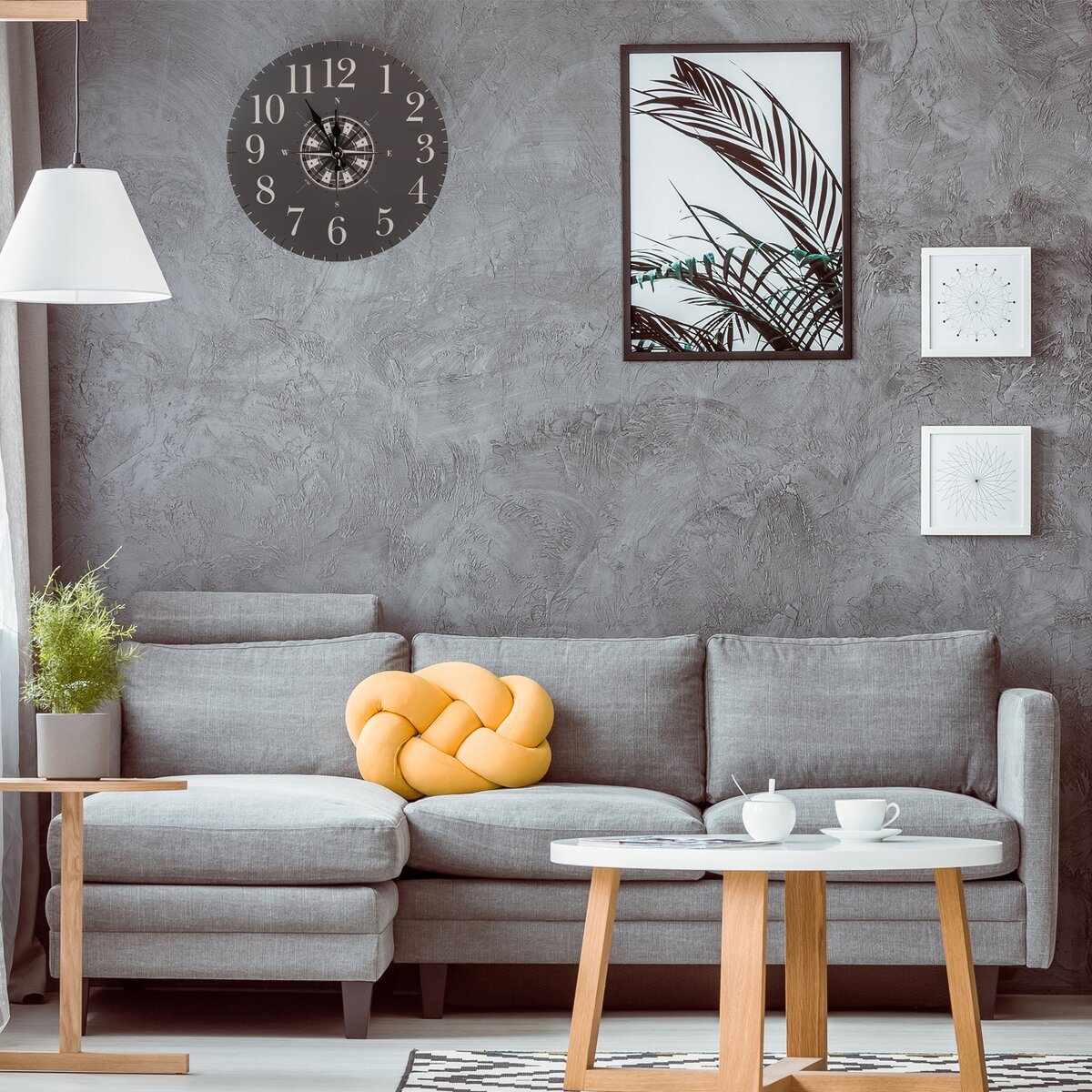 Zajímavé dřevěné hodiny průměru 34 cm, v neutrálním, šedém provedení, spojují oblíbený dekorativní prvek směrové růžice používané v kompasech a světlé, snadno čitelné arabské číslice.