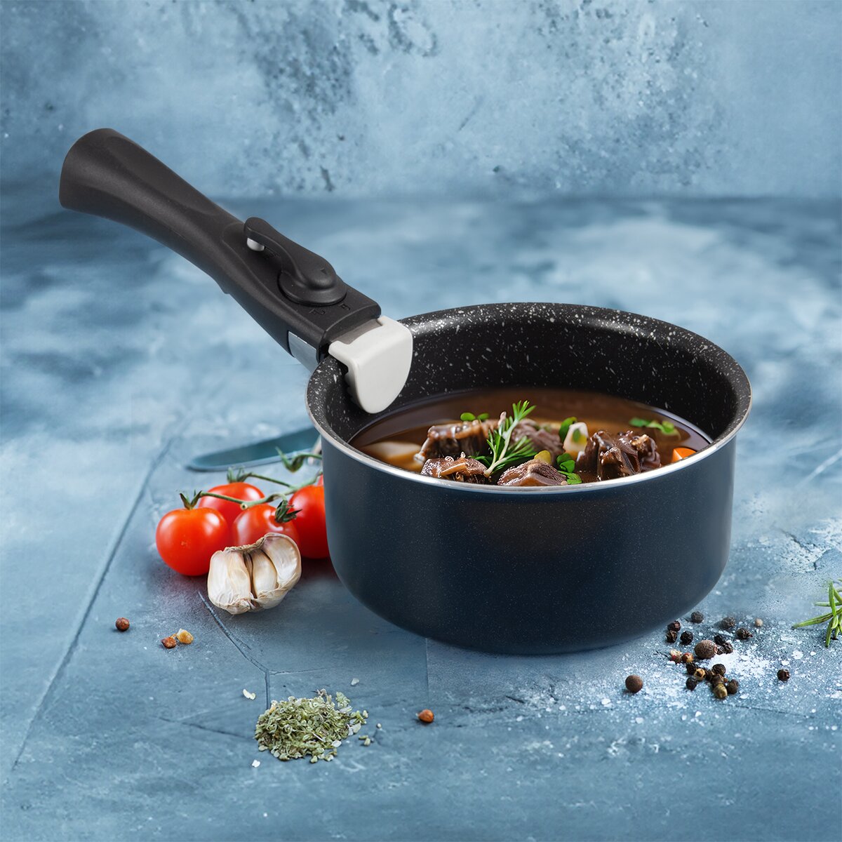 Jedna rukojeť je kompatibilní s různým nádobím v této kolekci (není součástí balení). Díky tomu ušetříte nejen místo v zásuvce, kde vám rukojeti nebudou překážet, ale hlavně můžete pokrm ze sporáku vložit rovnou do trouby, odepnout rukojeť a dopéct.